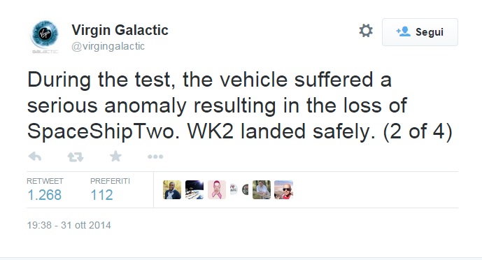 La società ha comunicato via Twitter di aver riscontrato un’anomalia sei minuti dopo la partenza, durante un test di volo al motore della navetta, portata in volo dalla “WhiteKnight2″.
