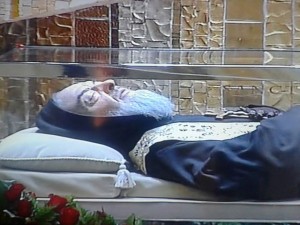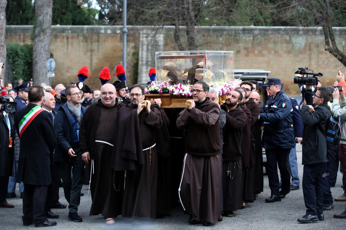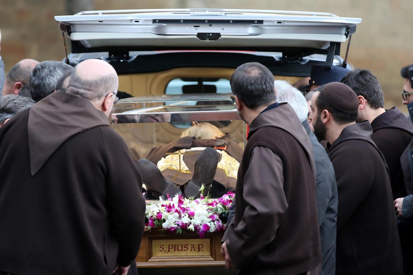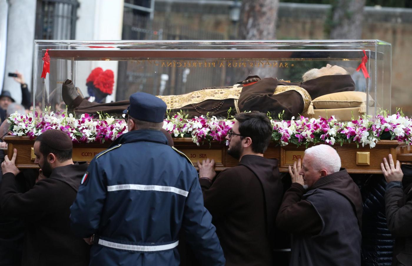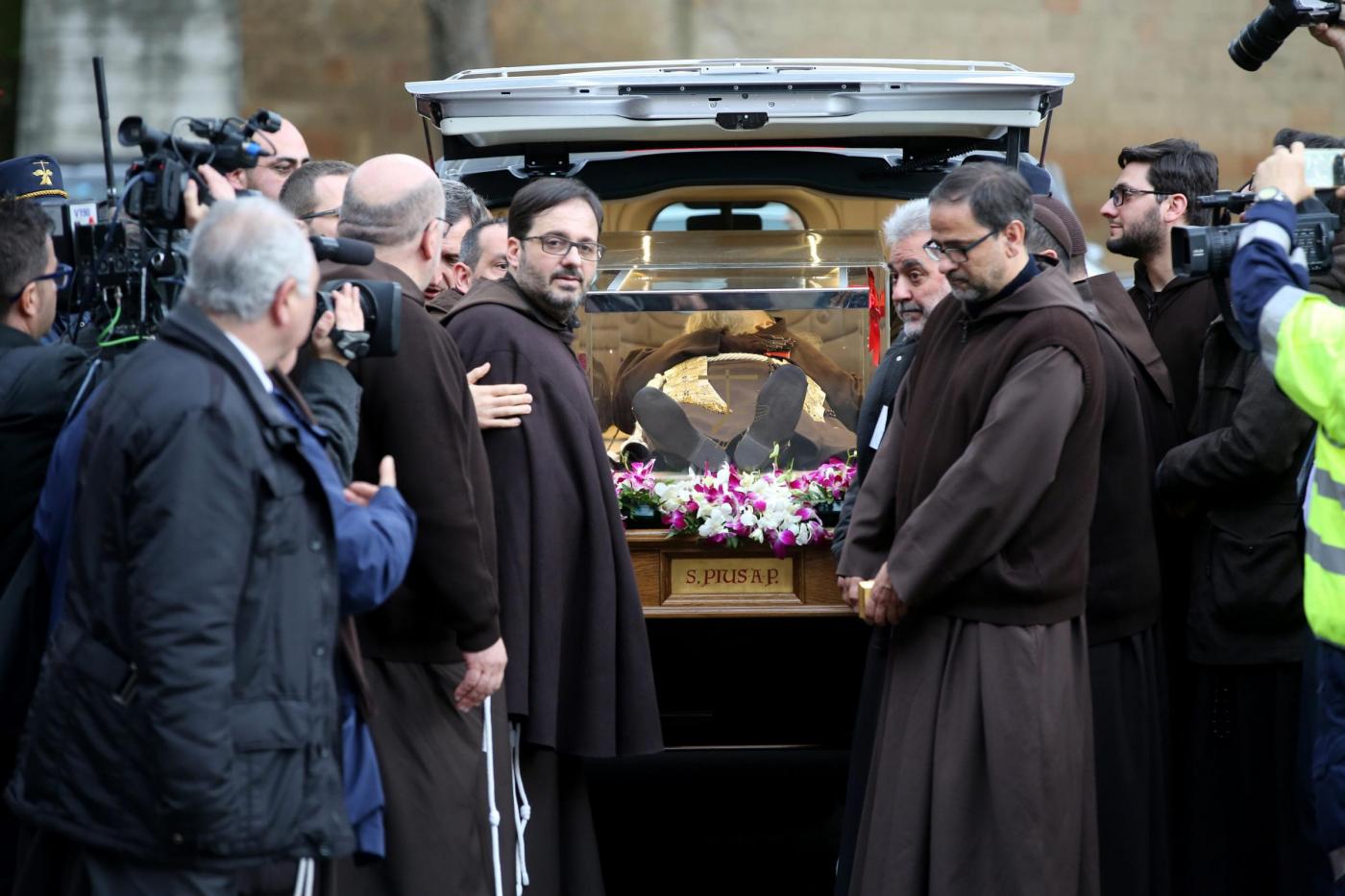 Migliaia di fedeli hanno salutato l’arrivo della teca di vetro con i resti mortali di Padre Pio. Il corpo del Santo è stato portato a spalle da dodici frati cappuccini come è tradizione nelle esequie dei membri di quest’ordine religioso. Un lungo applauso è scoppiato quando l’urna ha fatto ingresso nella Basilica di San Lorenzo, dove era già presente l’urna con i resti di un altro santo cappuccino, ugualmente canonizzato da San Giovanni Paolo II: Leopoldo Mandic, il cui corpo è arrivato da Padova, dove è molto venerato.