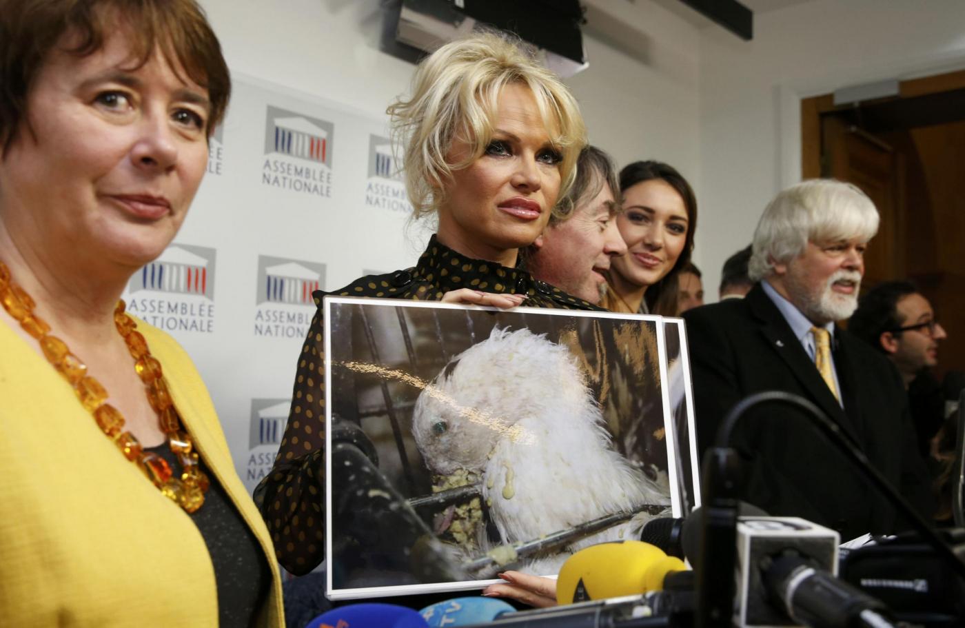 French deputy Laurence Abeille (L), Pamela Anderson (2ndL), actress and animals rights defender, Michel Vandenbosch (C), co-founder of the Belgian animal welfare organisation, Global Action in the Interest of Animals (GAIA), former Miss France Delphine Wespiser (2ndR) and Paul Watson (R), founder of Sea Shepherd Conservation Society attend a news conference at the National Assembly to protest the force-feeding of geese used in the production of foie gras, in Paris, France, January 19, 2016. REUTERS/Philippe Wojazer