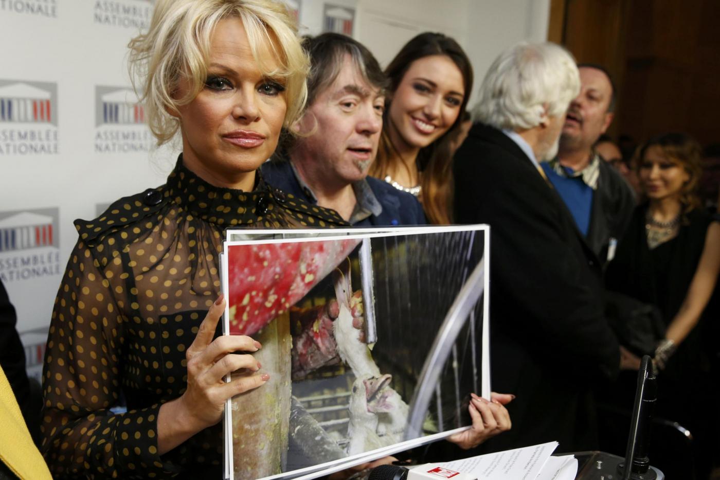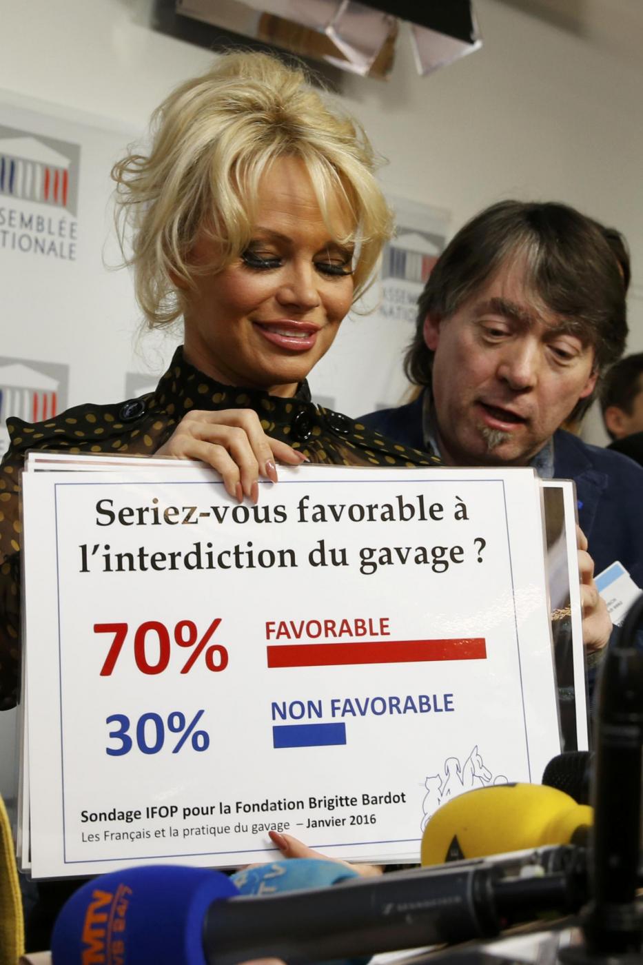 Pamela Anderson (L), actress and animals rights defender and Michel Vandenbosch (R), co-founder of the Belgian animal welfare organisation, Global Action in the Interest of Animals (GAIA) attend a news conference at the National Assembly to protest the force-feeding of geese used in the production of foie gras, in Paris, France, January 19, 2016. Anderson holds a pancard from a IFOP poll which reads, "Would you be favorable to banning force-feeding (of geese)" "70% in favor. 30% not in favor". REUTERS/Philippe Wojazer