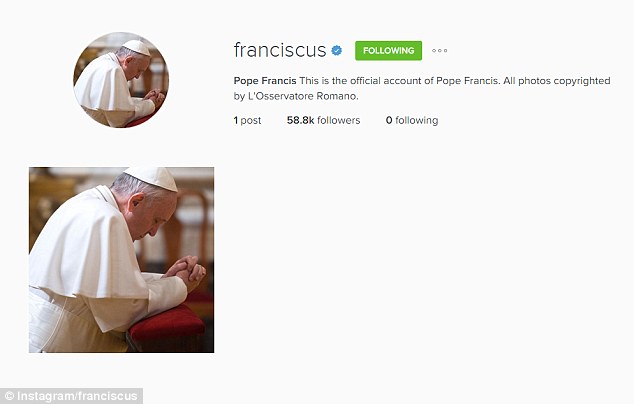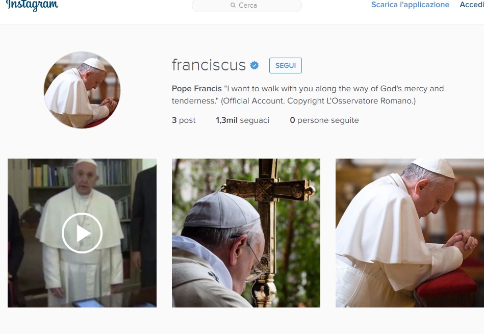 ROMA – Come annunciato nei giorni scorsi, Papa Francesco sbarca su Instragram con l’account “@Franciscus”, inaugurato alle 12 di sabato 19 marzo. Dopo i primi minuti, l’account aveva già diverse migliaia di seguaci, anche se privo ancora di foto. “Sii discreto” hanno scritto al Papa i primi commentatori rispondendo indirettamente al Daily Mail che scrive, scherzosamente, che ci dovremo aspettare foto con Francesco che si scatta dei “selfie”.