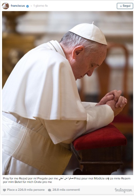 Poco dopo, Bergoglio non si è fatto attendere ed è arrivata la sua prima foto che lo ritrae inginocchiato in preghiera. Al momento della pubblicazione, i seguaci sono schizzati a dodicimila. Poi arriva il primo video in cui annuncia: