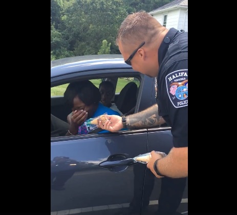 HALIFAX – Un agente di polizia del dipartimento di Halifax in Virginia ferma alcuni automobilisti per donare loro un cono gelato. L’idea è venuta ai due agenti Kevin Terre e Brian Warner. Nel filmato postato su Facebook da Terre, si vede l’agente che si avvicina ad un’auto guidata da una afroamericana, in auto con il figlio.