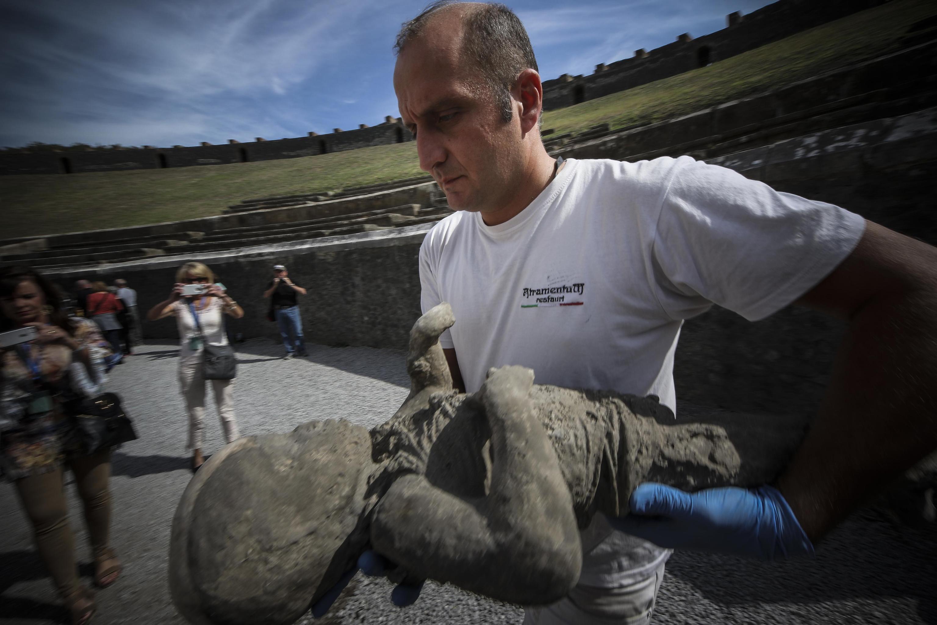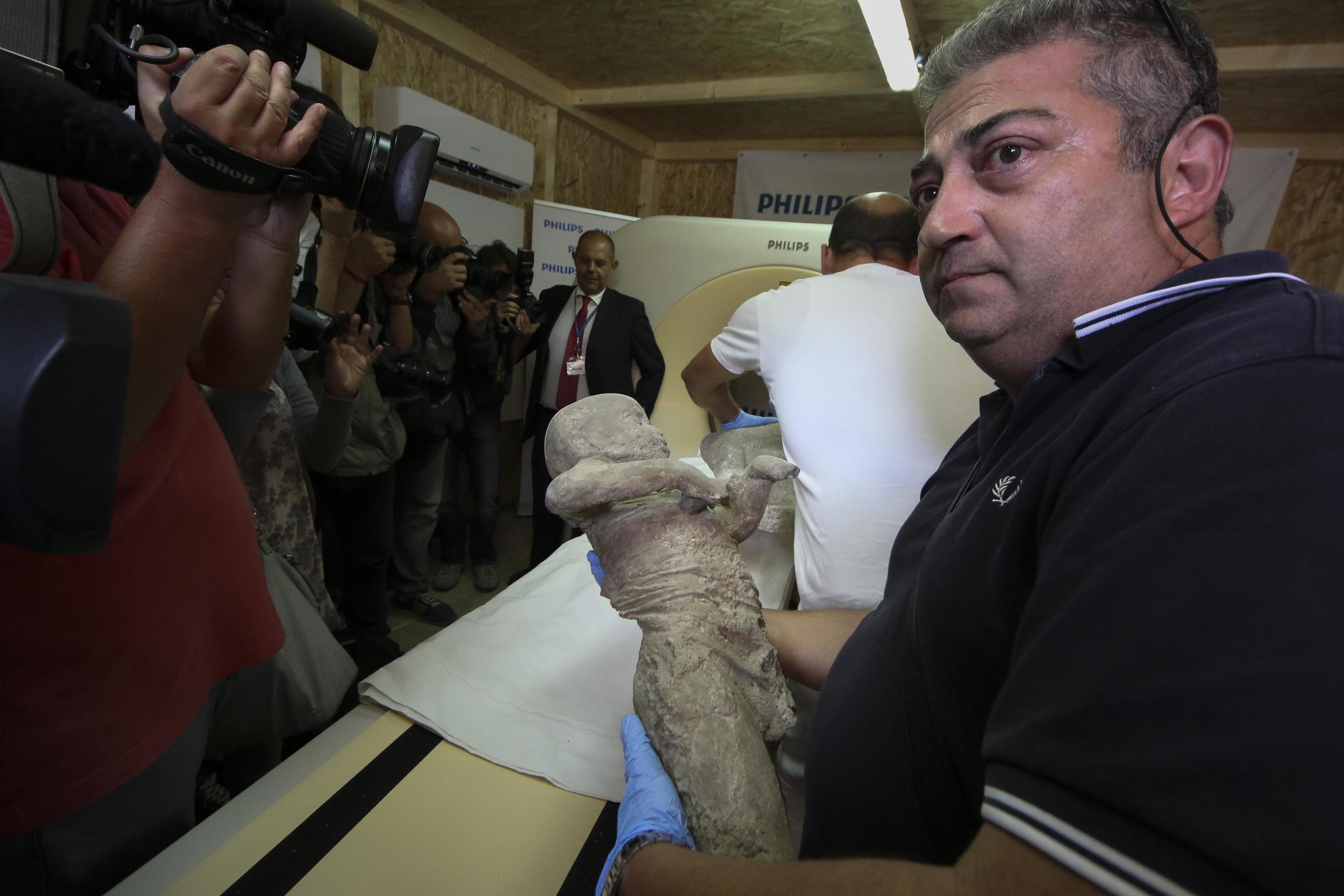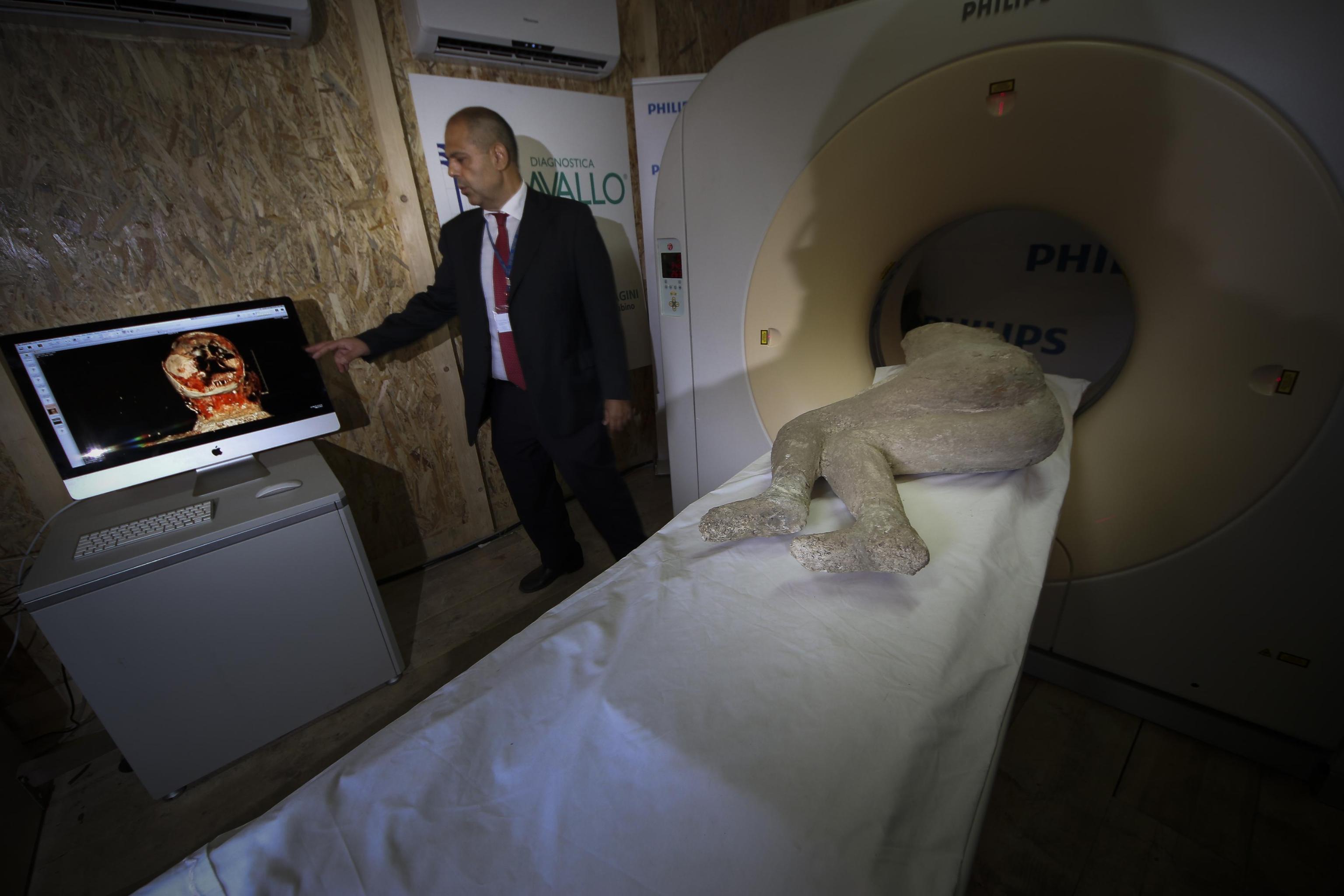 Uno dei problemi che abbiamo incontrato è la densità del gesso utilizzato per la tecnica del calcio – ha spiegato il soprintendente Massimo Osanna -: è una densità simile alle ossa, ecco perché è stato necessario ricorrere alla tecnologia della Tac da 16 strati messa a disposizione dalla Philips Spa Healthcare”. Il progetto coinvolge archeologi, antropologi, radiologi, odontoiatri e ingegneri per i rilievi scanner-laser. Lo scopo è di risalire alle abitudini di vita, all’occupazione, al ceto sociale dell’uomo nascosto nel calco e ha già rivelato, ad esempio, il danno subito dalle ossa dovuto all’eccessiva presenza di fluoro nelle falde acquifere vesuviane (foto Ansa, video LaPresse).