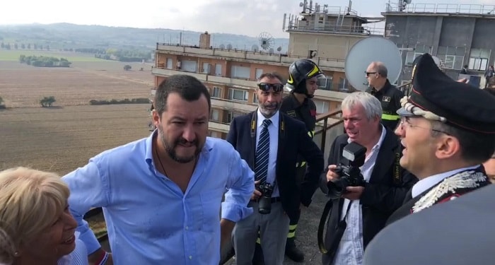 PORTO RECANATI (MACERATA) – Il ministro dell’Interno Matteo Salvini ha visitato l’Hotel House, il grattacielo multietnico di Porto Recanati, tatro in questi anni di diversi problemi di degrado e ordine pubblico. Sulla terrazza dello stabile, il ministro dell’Interno ha detto: “Questo c…di palazzo va abbattuto. Ci volgiono le ruspe“.