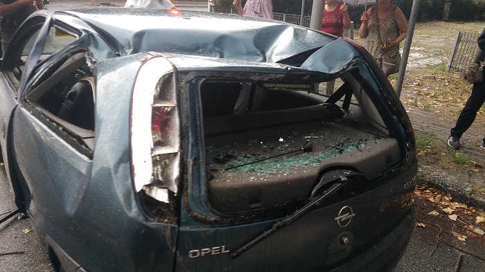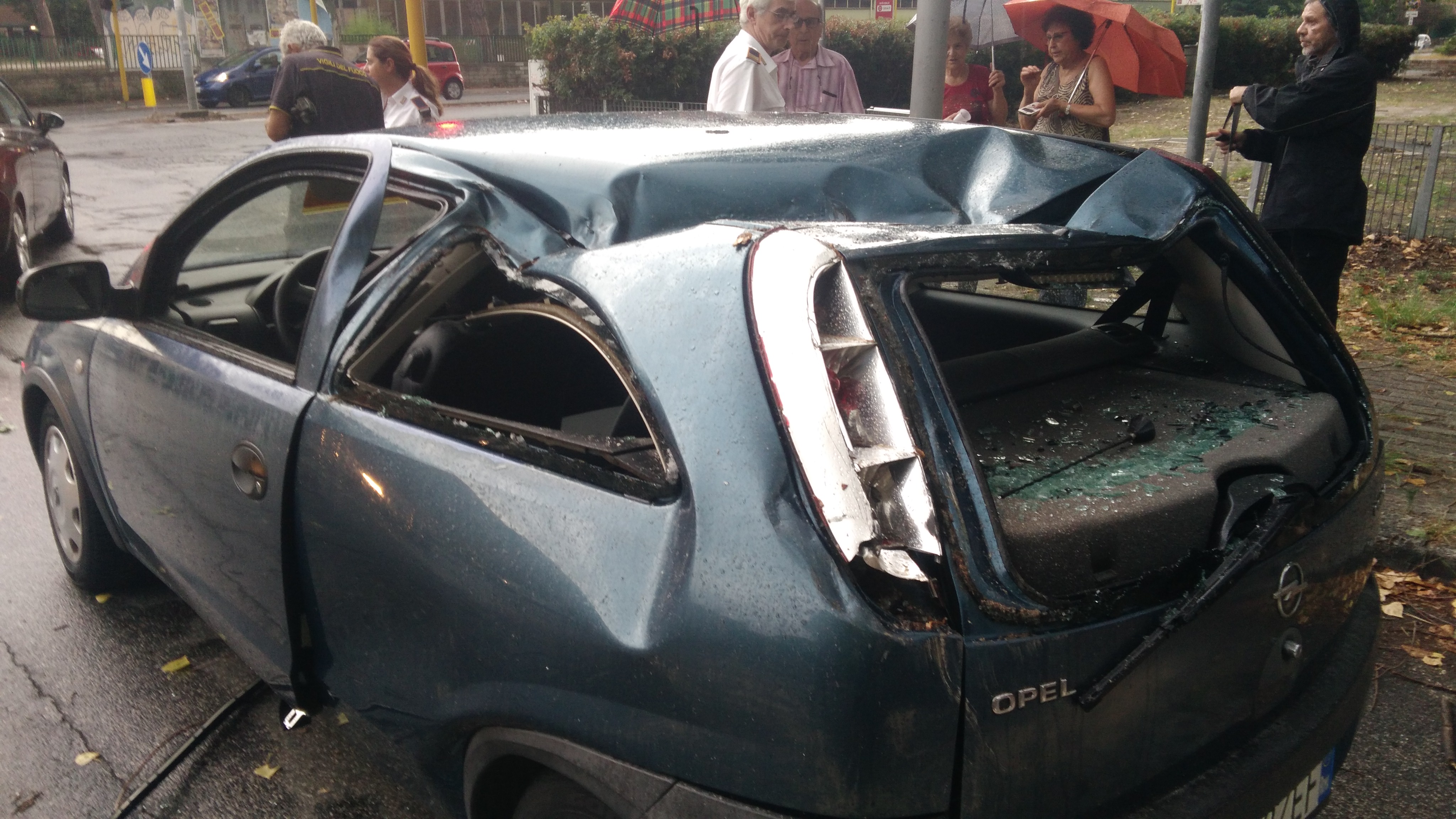 E’ accaduto nel pomeriggio di sabato 4 agosto. Come mostrano le immagini che seguono, realizzate in esclusiva da Blitz Quotidiano, se l’enorme ramo fosse crollato pochi istanti prima, le due persone a bordo avrebbero subito danni ben più gravi. Dopo essere scesi dall’auto, visibilmente sotto choc, i due hanno raccontato: “Abbiamo sentito un tonfo ma non ci siamo resi conto di quello che stava accadendo”. La loro auto, una Oper Corsa, ora è da rottamare: la forza del ramo ha completamente schiacciato la carrozzeria nella parte posteriore.