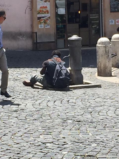 “A mollo nella fontana dei Catecumeni del 1580 di Giacomo della Porta. Nella antica Piazzetta Madonna dei Monti interamente vincolata dal Decreto Galasso tutto è concesso, abbandonata da ogni istituzione: l”unico valore perseguito e rispettato pare essere la vendita delle birre”.