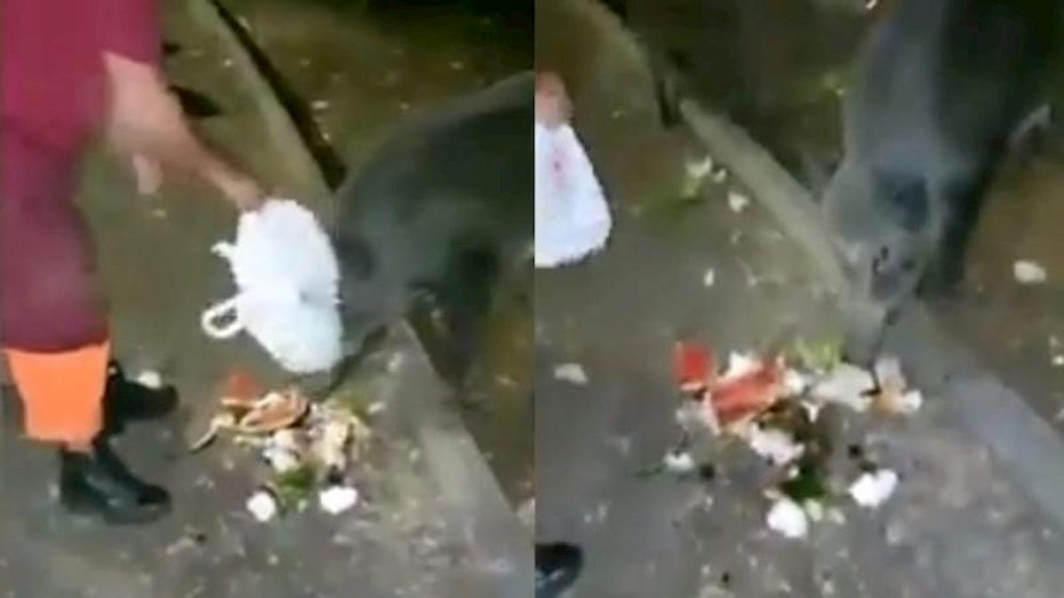Uno screenshot del video che ritrae operatori Ama mentre danno da mangiare rifiuti ad alcuni cinghiali in strada