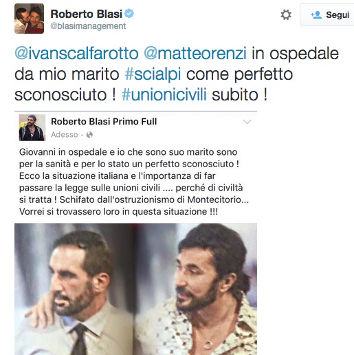 “Il nostro matrimonio è importante anche per ragioni oltre che emotive, anche molto pratiche – aveva aggiunto Roberto Blasi -. Perché abbiamo intenzione di trasferirci qui in America per aprire un’attività alberghiera. Io in Italia ho avuto un hotel per dodici anni. Ora vogliamo aprire a Los Angeles un piccolo hotel. E qui essere sposati ha valenza piena, ci sono tante di quelle tutele che in Italia purtroppo mancano”.