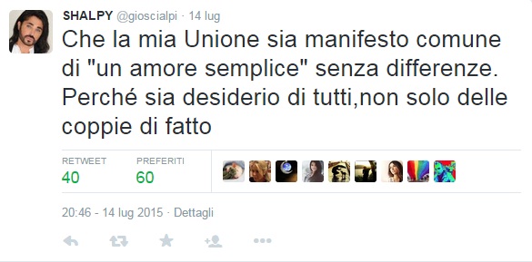La cerimonia venne documentata da “Chi” con un servizio fotografico esclusivo. “Certo – spiegava Scialpi – noi un ménage familiare ce l’avevamo già. Ma c’è in più quella grandissima soddisfazione di poter dire: ‘E’ mio marito’. E questa è un’ emozione che io non avevo mai provato prima nella vita. E’ importante per una persona poterlo dire, con fierezza e con amore, e trovare così il proprio posto nel mondo. E’ una battaglia che abbiamo combattuto e, ufficializzando la nostra unione (spero) abbiamo vinto: abbiamo superato i pregiudizi delle famiglie, ci siamo esposti dal punto di vista mediatico. Facendolo non hai la certezza che la gente possa capire, magari ti dicono: Lo state facendo apposta, lo state facendo per fare notizia. E noi, dalla nostra abbiamo solo una cosa: la verità”.