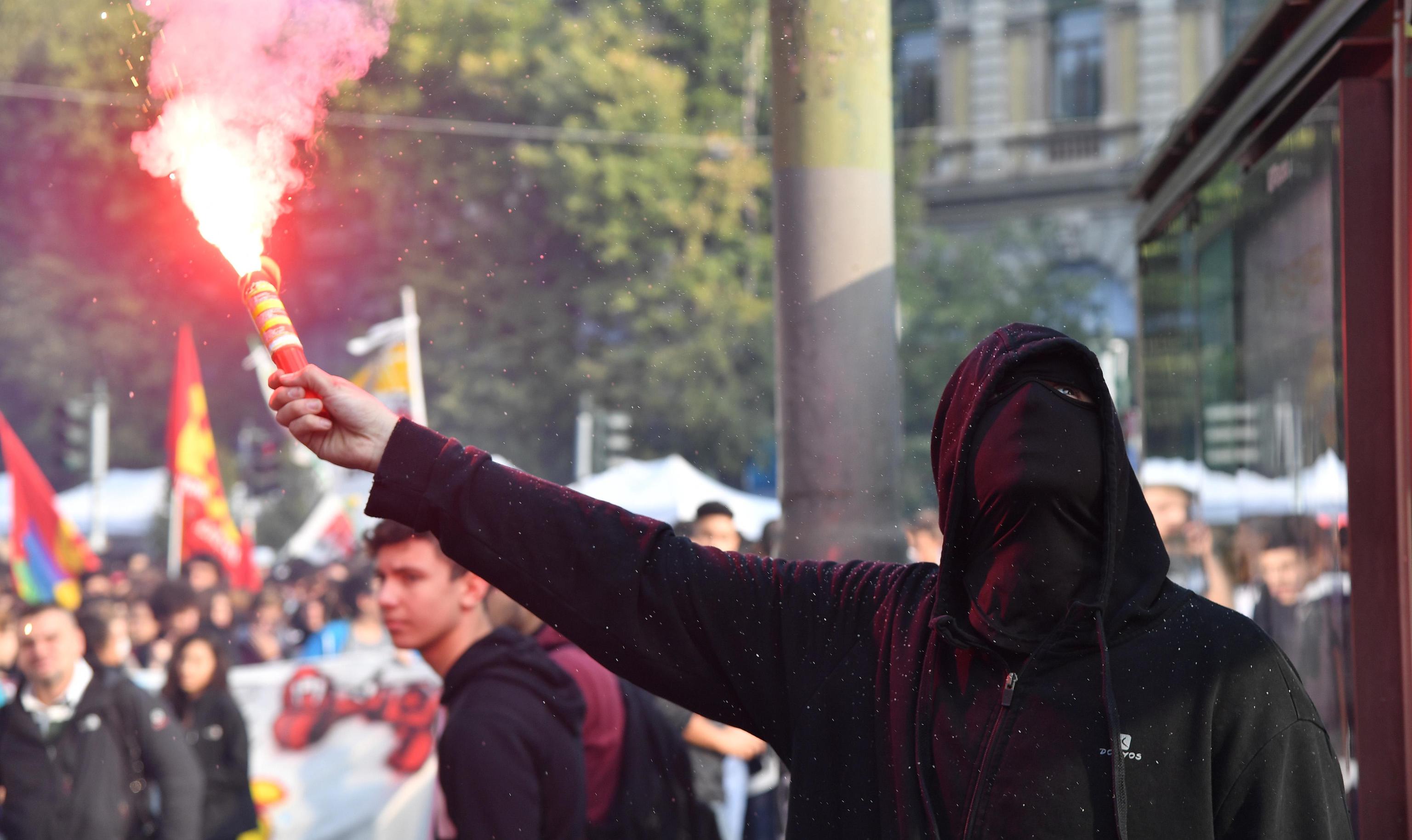 Lanci di uova, verdura e fumogeni anche contro palazzo Turati, sede della Camera di commercio, in via Meravigli. Alcuni incappucciati hanno imbrattato anche con vernice colorata l’ingresso del palazzo. Presi di mira anche un ufficio postale e una filiale della catena di abbigliamento Zara (foto Ansa, video del lancio di oggetti Agenzia Vista/Alexander Jakhnagiev).