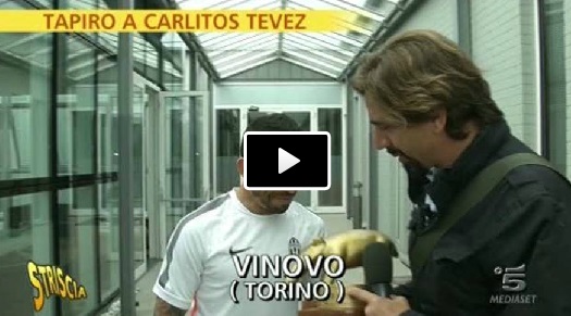 ROMA – Valerio Staffelli di Striscia la notizia ha consegnato a Carlo Tevez il tapiro d’oro dopo che all’attaccante della Juventus รจ stata ritirata la patente per eccesso di velocitร .