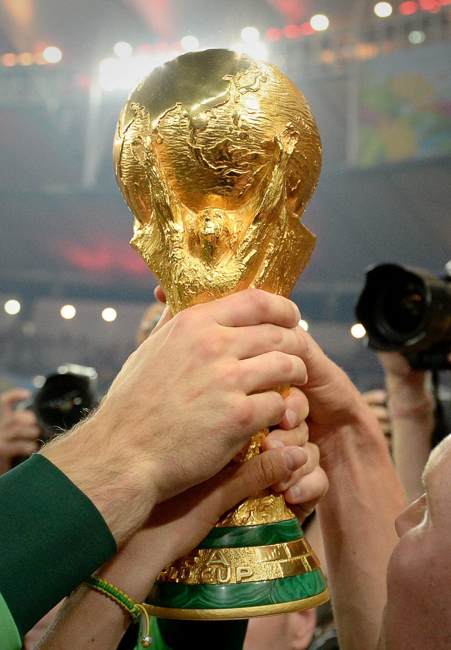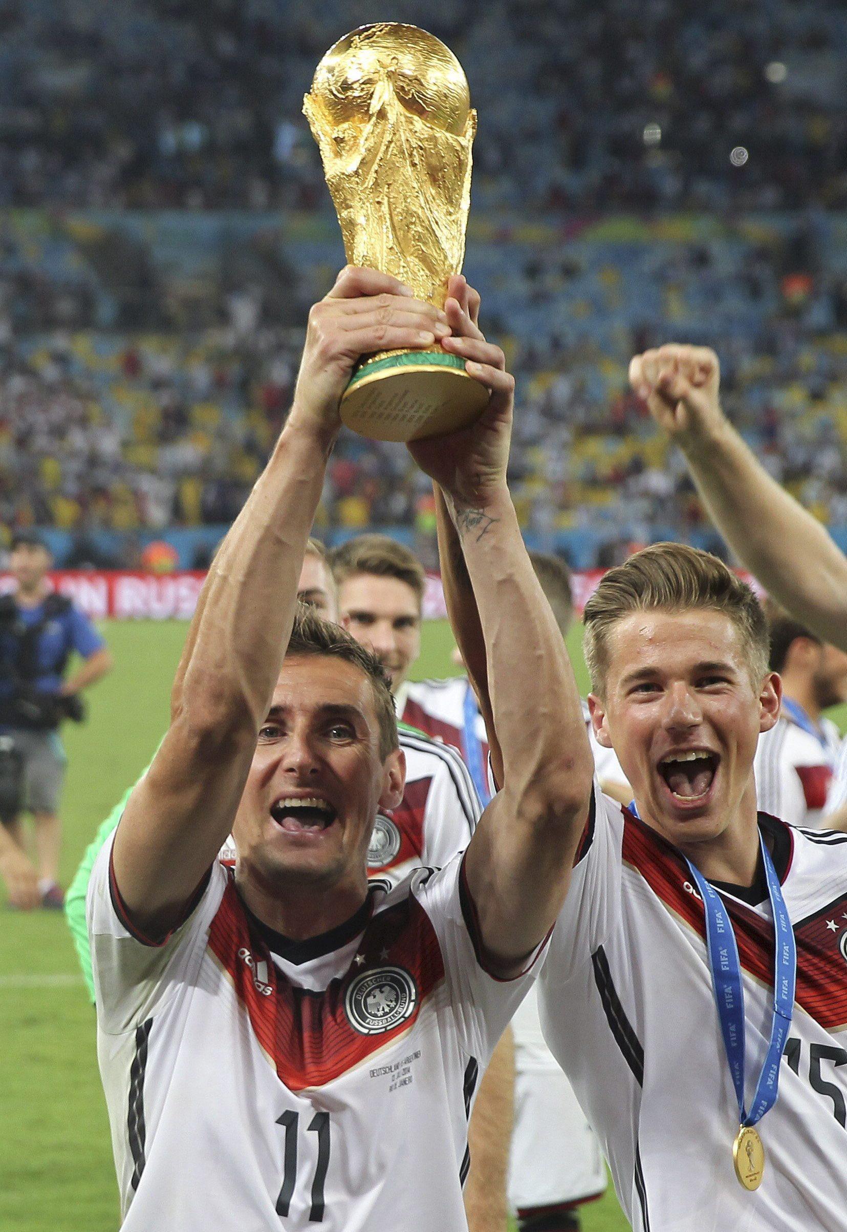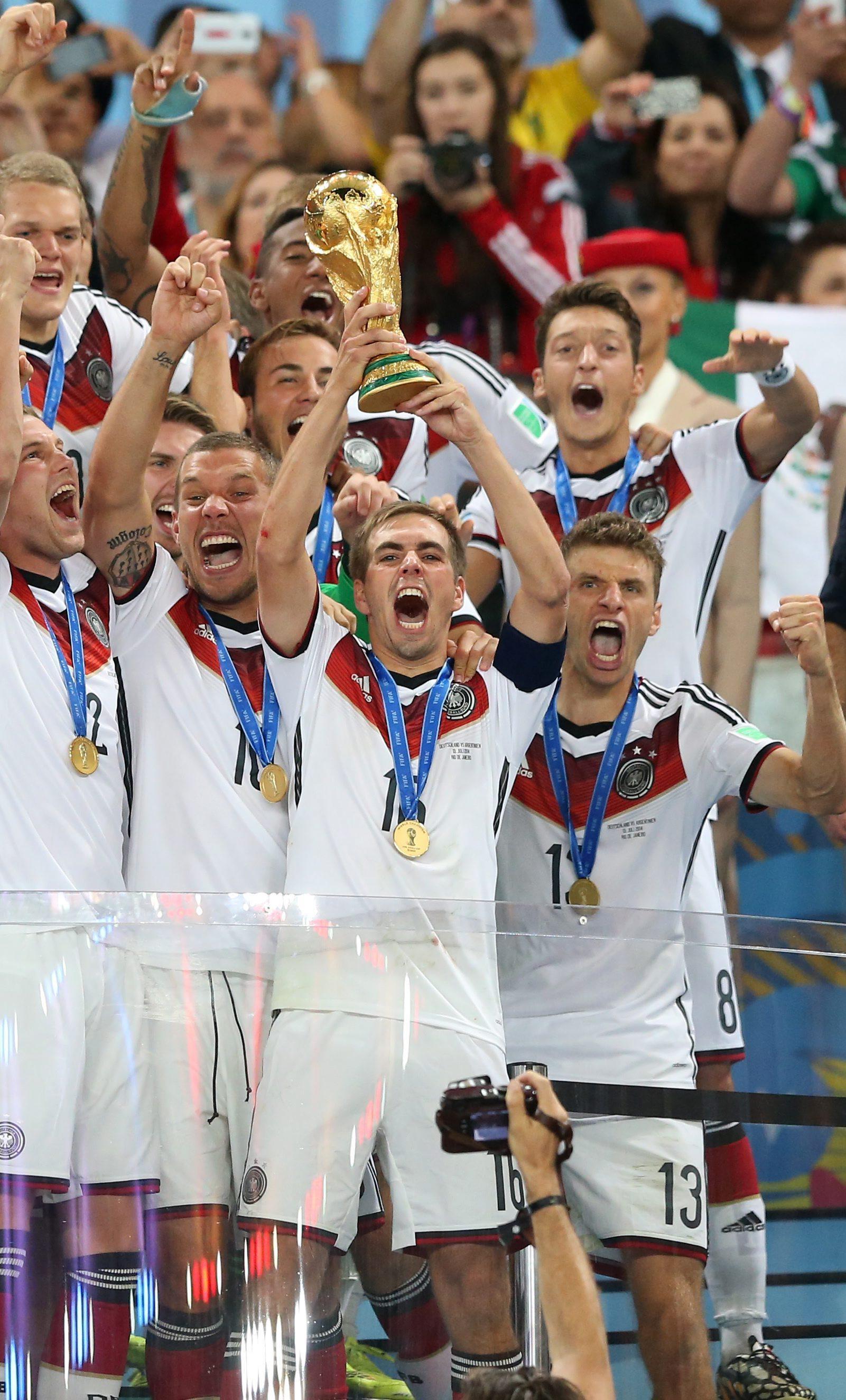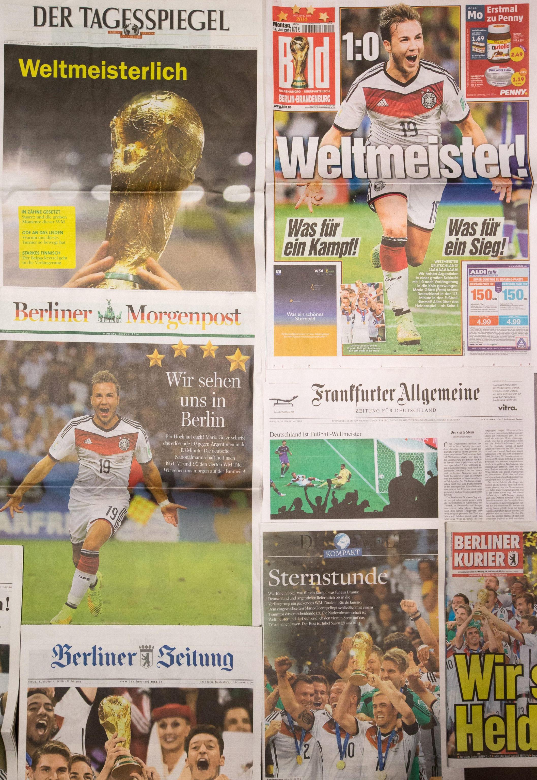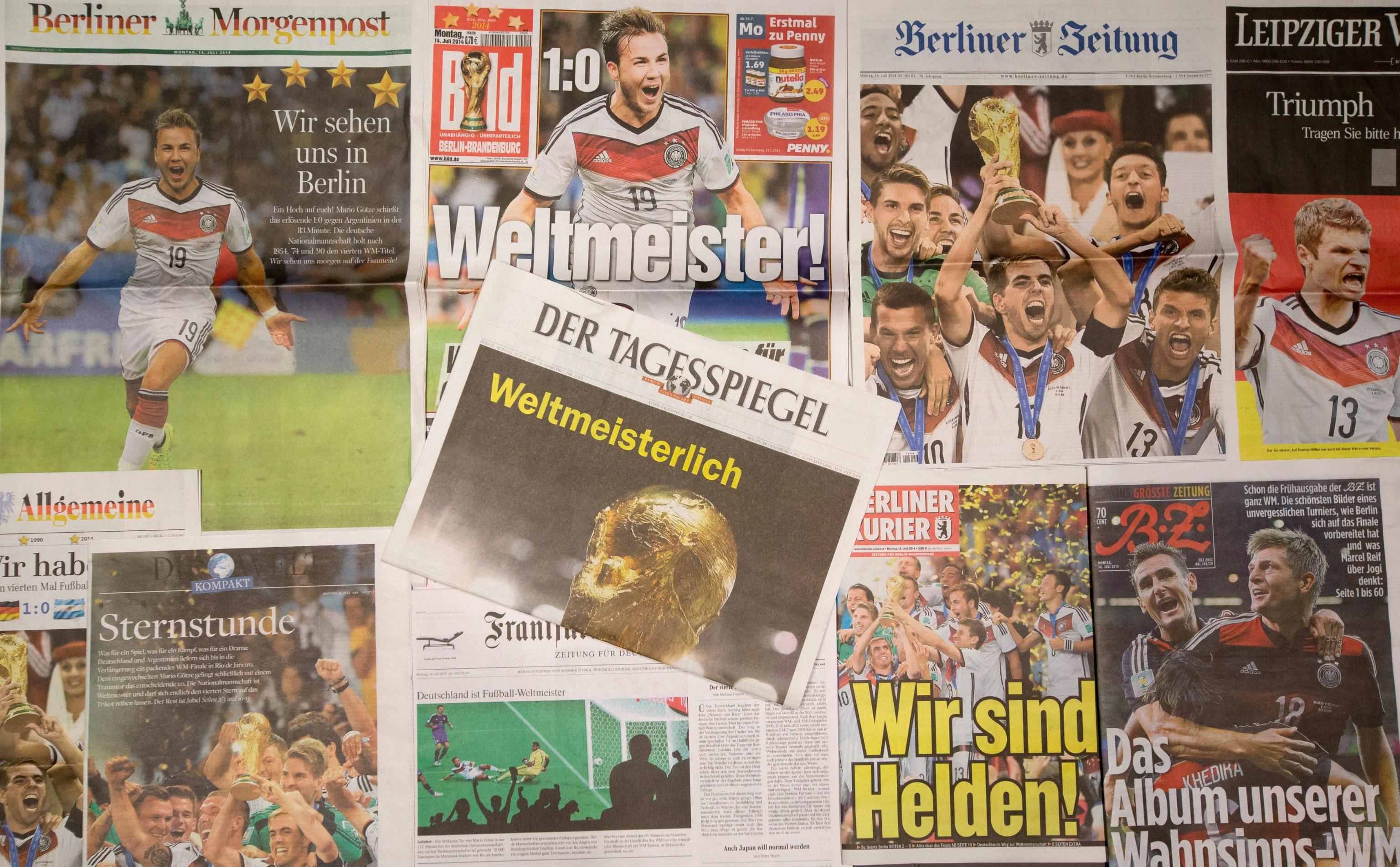 I giocatori tedeschi alzano la coppa al cielo e le prime pagine dei giornali tedeschi