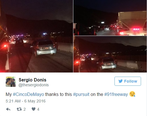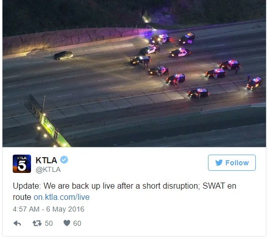 L’uomo alla guida è stato descritto dallo sceriffo locale come pericoloso. L’inseguimento si è concluso verso le 9,40 di sera e le due corsie della superstrada dopo che gli agenti hanno lanciato lacrimogeni contro l’auto nera. Durante l’inseguimento, l’auto alla guida dell’auto tedesca ha colpito circa 6 auto. Riprese aeree rilanciate da Los Angeles Times che sembrano un film d’azione mostrano diverse auto della polizia che inseguono il rapinatore.