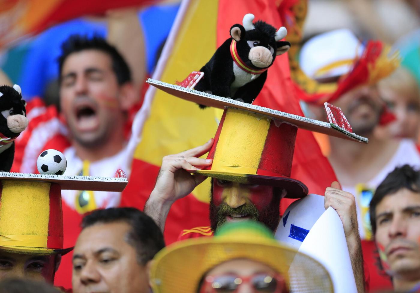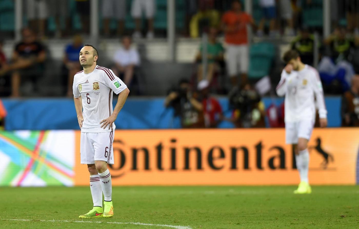 Spagna (4-2-3-1): Casillas 5; Azpiliqueta 4.5, Piquè 4.5, Sergio Ramos 4.5, Jordi Alba 4.5; Xabi Alonso 6 (64′ Pedro 5.5), Busquets 5; Iniesta 5.5, Xavi 5.5, Silva 5.5 (78′ Fà bregas senza voto); Diego Costa 5 (63′ Torres Sanz senza voto). A disp. Reina, De Gea, Albiol, Javi Martinez, Juanfran, Koke, Cazorla, Mata, Villa. All. Del Bosque 4.