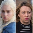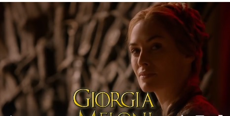 “Una donna violenta pronta a cambiare..con Photoshop” è la presentazione della Meloni, il cui personaggio corrisponde a Brienne di Tarth. “Un uomo che si ritira e leva le tende” è invece Stannis Baratheon dopo la sconfitta nella Baia delle Acque nere.
