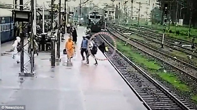 NEW DELHI –  Una donna e il suo bambino stanno attraversando i binari nella stazione di Dahod, nella regione del Gujarat in India, quando un treno arriva e rischiano di essere investiti. Quando la donna si è vista il treno davanti ha prontamente spinto il figlio al sicuro sulla banchina e poi due persone presenti l’hanno aiutata a mettersi in salvo.