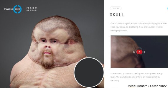 Posizionando il cursore sulla testa dello strano personaggio, ecco che salta fuori la spiegazione di ciò che potrebbe accadere se subisse un forte trauma cranico: “In un incidente stradale, abbiamo a che fare con forze molto più potenti dei colpi fisici che il nostro cervello è programmato a prendere. Queste forze possono causare un impatto con il cranio e così portare ad una distruzione neuronale e ad un danneggiamento dell’intera struttura del cervello”. Ecco allora perché Graham esibisce una testa molto più grande della nostra: il cranio è disegnato apposta per sopportare meglio i traumi.