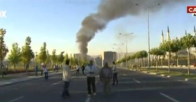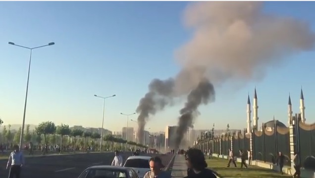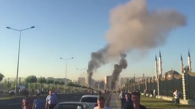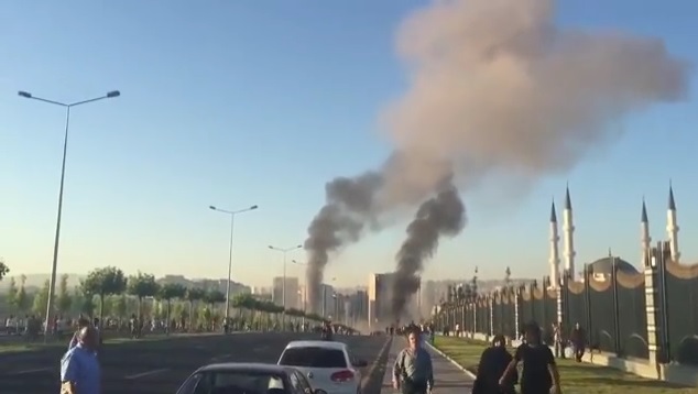 ISTANBUL – Fallito colpo di stato militare in Turchia: 90 morti, 1500 arresti. Nelle prime ore di sabato 16 luglio 2016, i golpisti hanno provato a bombardare il palazzo del Presidente della Repubblica turca Recep Erdogan, due bombe, sganciate da un aereo F-16 pilotato da un golpista, sono cadute vicino ma non sembrano avere causato danni. Nella foto, scattata da una certa distanza, si vedono due colonne di fumo, una più vicina sulla sinistra, un’altra a destra. La strada sembra bloccata da poliziotti in borghese.