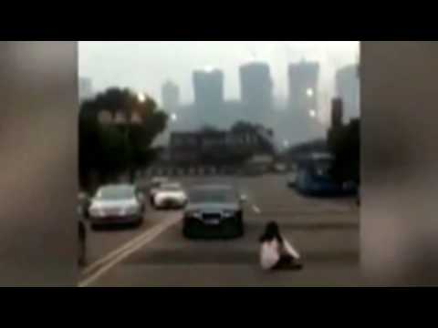 PECHINO – Una donna scende dalla sua auto e viene quasi travolta. La vettura non ha il freno a mano inserito e comincia ad andare indietro.
