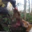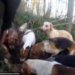 LONDRA – Cani feroci attaccano brutalmente una volpe uccidendola. Il video sconsigliato ad un pubblico sensibile lo pubblica il Daily Mail che parla di “caccia illegale”. Il filmato è stato girato sabato e mostra più di venti cani che attaccano una volpe inerme. Un’attivista contrario alla caccia prova a strillare ai cani sperando che si allontanino. Poi si fa strada tra i cani e alza in alto il corpo ormai senza vita e ridotto a brandelli della volpe.