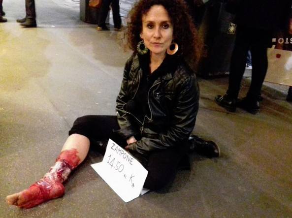 MILANO – Un gruppo animalisti ha “occupato” l’ingresso della gastronomia Peck a Milano, vero e proprio tempio dei salumi. Ai clienti hanno mostrato le loro gambe insanguinate e fasciate e confezionate come zamponi per protestare contro “la strage di suini a Capodanno”.