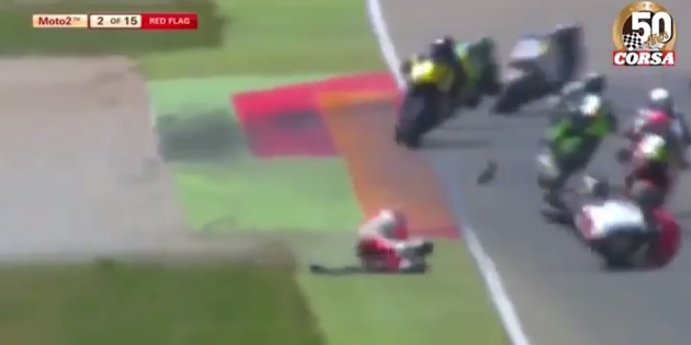 MADRID –ย Spaventoso incidente al via di Gara 2 del CEV Moto2 al MotorLand Aragรณn di Alcaรฑiz. In uscita dalla curva 15 che immette sul lungo rettifilo da oltre 1 chilometro opposto alla corsia dei box Xavi Cardelus ha perso il controllo della propria KALEX, provocando una carambola con piรน piloti coinvolti. La sua moto รจ letteralmente rimbalzata dall’esterno della pista al centro del nastro dโasfalto, perdendo il serbatoio, sfortunatamente centrato da un altro concorrente. Serbatoio che, al contatto con l’altra moto, รจ letteralmente esploso.