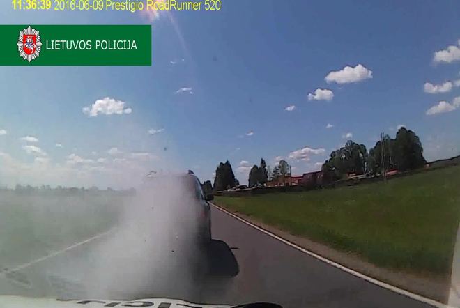 Lo dimostra questo video diffuso dalla polizia, che mostra un inseguimento in cui un uomo a bordo di una Volvo che sta scappando sulle strade nei pressi di Marijampolė. Dall’auto improvvisamente, per seminare la pattuglia che cerca di fermarla anche mandandola fuori strada, viene sputato improvvisamente prima del fumo e poi dei chiodi che servono per bucare le gomme