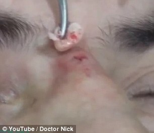 ROMA – Un uomo con una grande cisti sul naso, viene incisa e rimossa dal medico dermatologo americano che su YouTube si firma Dr. Nick. Non appena viene effettuato un piccolo buco, dal naso fuoriesce un grumo bianco enorme.