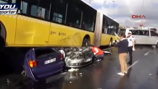 ISTANBUL – Undici persone sono rimaste ferite in Turchia, dopo che un bus è finito sopra tre auto schiacciandole. La dinamica dell’incidente accaduto venerdì sull’autostrada D-100, nel distretto di Acibadem, non lontano dalla capitale Istanbul, ha dell’incredibile: a causarlo sarebbe stato un uomo che ha cominciato a prendere ad ombrellate l’autista.