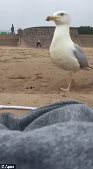 Una volta che i due si erano allontanati, il gabbiano ha afferrato in un attimo il telefonino con il becco prima del ritorno del proprietario. Il furto è però quasi riuscito: il ragazzo infatti, tornando sul posto in cui è avvenuto il furto riesce a spaventare il gabbiano che lascia il telefonino quasi subito.