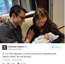 NEW YORK – Hillary Clinton è di nuovo nonna. Chelsea Clinton ha partorito: al New York’s Lenox Hill Hospital è nato Aidan. L’annuncio è affidato a Twitter. ”Siamo contenti di celebrare la nascita di nostro figlio, Aidan” afferma Chelsea, che ha già una figlia, Charlotte. La nascita è avvenuta sabato scorso: la stanza in cui è stata ricoverata Chelsea, costa la bellezza di 1700 dollari a notte.
