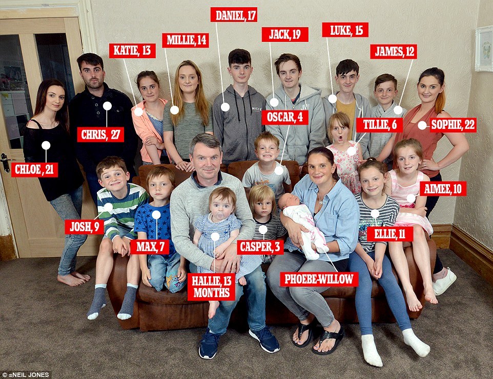 La coppia è stata intervistata con i loro figli da Channel 4 che ha dedicato loro una serie di documentari. Phoebe si unisce ai fratelli Chris, 27, Sophie, 22, Chloe, 21, Jack, 19, Daniel, 17, Luca, 15, Millie, 14, Katie, 13, James, 12, Ellie, 11, Aimee, 10 Josh, 9, Max, 7, Tillie, 6, Oscar, 4, Casper, 3 e Hallie, 13 mesi. I coniugi si considerano genitori di 19 bambini ma raccontano di aver perso Alfie nel luglio 2014, a 23 settimane di gravidanza. Per questo hanno dato ad Hallie nata la scorsa estate, il secondo nome ‘Alphia’ per voler omaggiare suo fratello.
