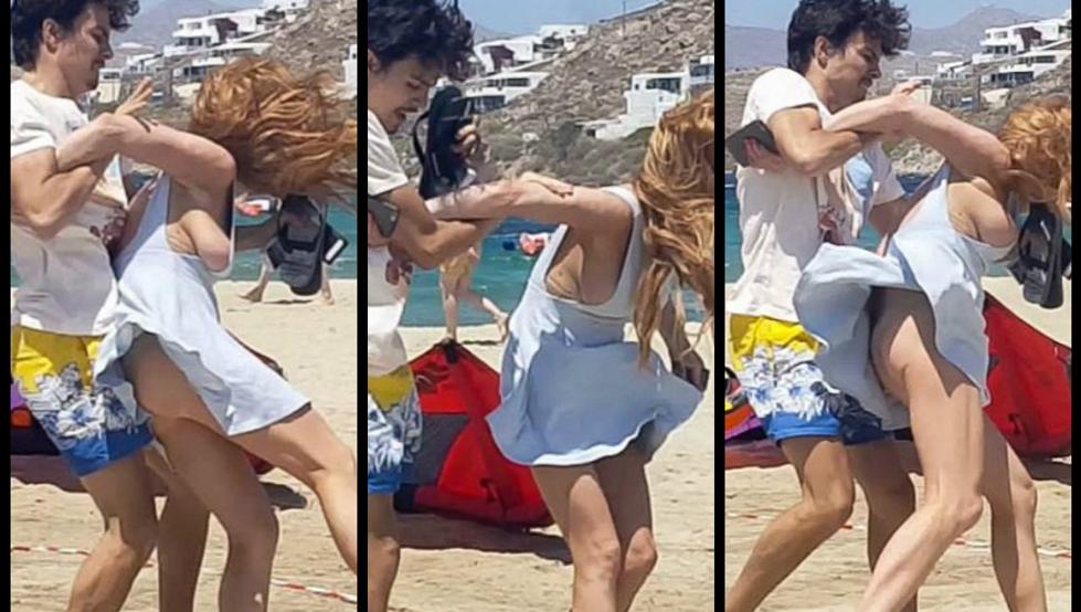 La Lohan scende dal fuoristrada nero dopo aver buttato il cellulare di Egor sulla spiaggia. Lui la rincorre, l’afferra con la forza e le blocca le braccia dietro la schiena facendo uscire dal vestito un seno subito notato da alcuni siti italiani e non. Recuperato il cellulare, lui si allontana furibondo.