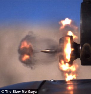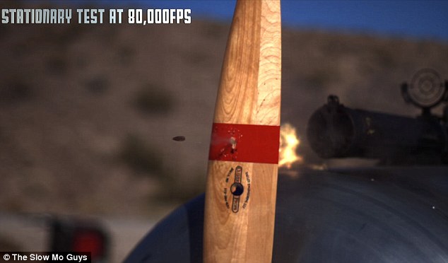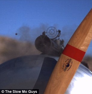 Il filmato al rallentatore è stato girato nel deserto del Nevada e mostra quello che succede se la macchina di sincronizzazione dovesse incepparsi, con diversi proiettili che colpiscono l’elica che, nell’esperimento, va a soli 200 giri al minuto.