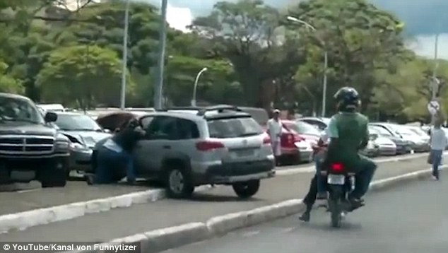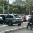 ROMA – Un motociclista viene investito dopo aver preso violentemente a calci la macchina di una donna al volante di un crossover della Fiat. Siamo in una città del Brasile: auto e moto sono congestionati nel traffico. L’auto probabilmente ha stretto il motociclista (dal video non si capisce) che reagisce con un bel calcio sull’auto. La donna alla guida, a questo punto, si avvicina pericolosamente alla moto e la fa cadere giù. Poi, secondo quanto racconta il Daily Mail, la donna sembra voler accostare.