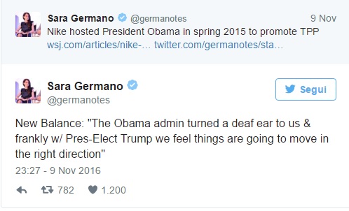 Tutto è iniziato con una dichiarazione su Twitter del portavoce della società, citata dalla giornalista del Wall Street Journal Sara Giordano:”Barack Obama è rimasto sordo alle nostro richieste e, francamente, con il presidente Trump sentiamo che le cose andranno per il verso giusto”, si legge nel messaggio. Il riferimento è alla Partnership Trans Pacifica (o Tpp), un accordo con lo scopo di promuovere il libero scambio e investimento tra i paesi partner, che Trump ha promesso di abolire.