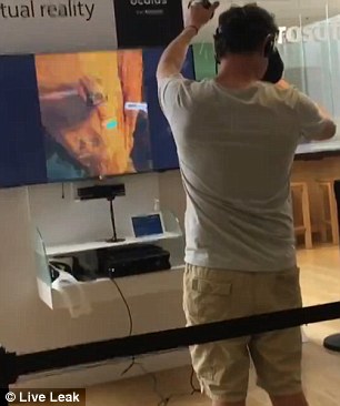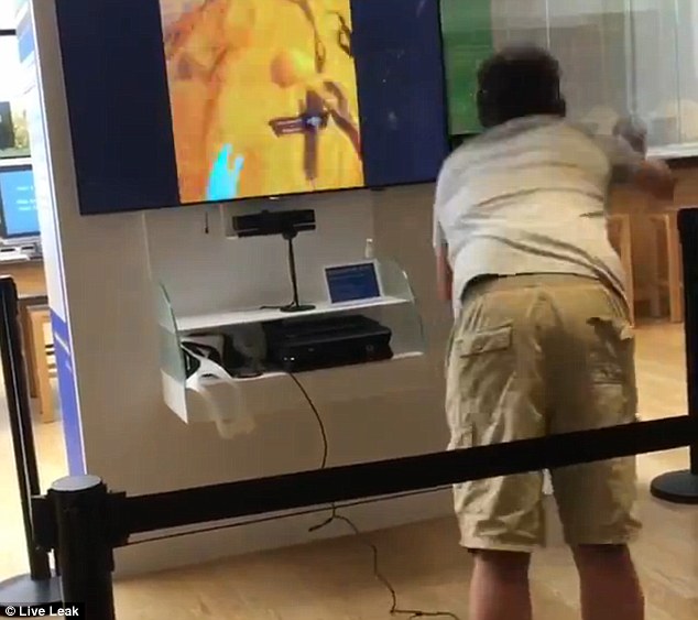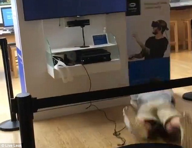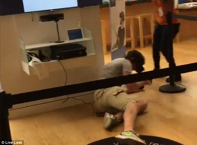 Il ragazzo indossa un auricolare e tiene un joystick con entrambe le mani. Prima alza entrambe le braccia come se si stesse “virtualmente” arrampicando su un albero. Poi perde l’equilibrio e cade con la faccia, rovesciando un display promozionale a terra. Un assistente del negozio corre in suo aiuto per chiedergli: “Sei ok?” La gente presente ride e sospira meravigliata per quanto accaduto. Il commesso chiede poi al giovane se vuole proseguire e il video pubblicato su YouTube termina qui