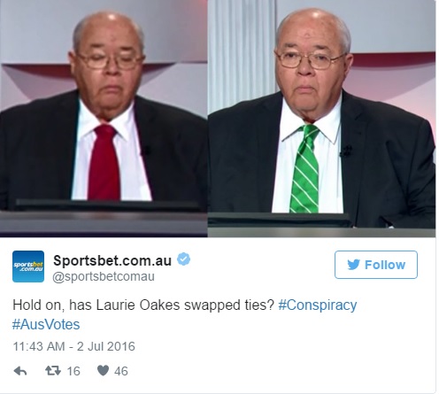 SYDNEY – “Quale indosserà?”: blocca scommessa cambiando 6 cravatte in diretta. Il giornalista australiano Laurie Oakes non deve amare molto i bookmakers che in Gran Bretagna e Australia scommettono su tutto. Durante una diretta di Nine News, Oakes si è cambiato la cravatta sei volte per evitare che si potesse scommettere sul colore della sua cravatta. E’ avvenuto durante un dibattito elettorale (in Australia si è votato in questi giorni n.d.r): il suo scopo era proprio quello di boicottare una nota società di scommesse, la Sportsbet, che aveva fatto scommettere i suoi clienti sul colore della cravatta scelta da Oakes.