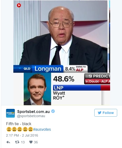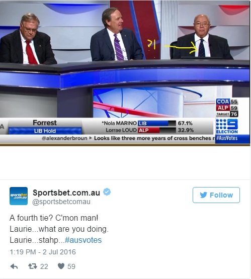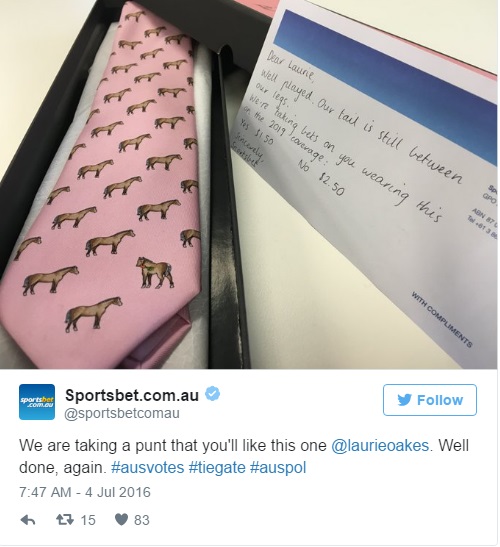 Il giornalista è venuto a conoscenza della scommessa ed ha tirato fuori il suo asso nella manica. Al primo scambio i bookies (coloro che scommettono n.d.r.) sono rimasti sconcertati. Al quinto, l’azienda ha deciso di pagare una quota fissa a tutti gli scommettitori. Alla domanda del perché ha deciso di fare una cosa del genere, Laurie Oakes ha spiegato: “Ho pensato: perché qualcuno dovrebbe perdere? E così ho indossato tutti i colori su cui si poteva scommettere”.