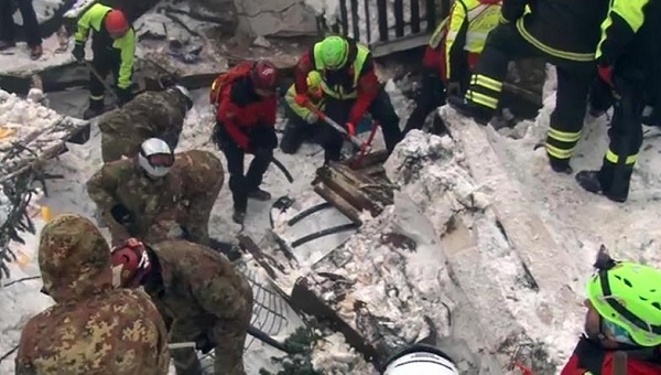 Questi sono attualmente impegnati nella rimozione degli accumuli nevosi in prossimità dell’edificio particolarmente concentrata nella zona posteriore dell’albergo. Ancora sfavorevoli le previsioni meteo per la giornata e resta alto nella zona delle operazioni l’indice di rischio valanghe fornito dal servizio dei carabinieri forestali specializzato nel rilevamento e monitoraggio valanghe e servizio meteomont, condizioni che tra l’altro ostacolano l’utilizzo degli elicotteri dei vigili del fuoco e dei carabinieri.