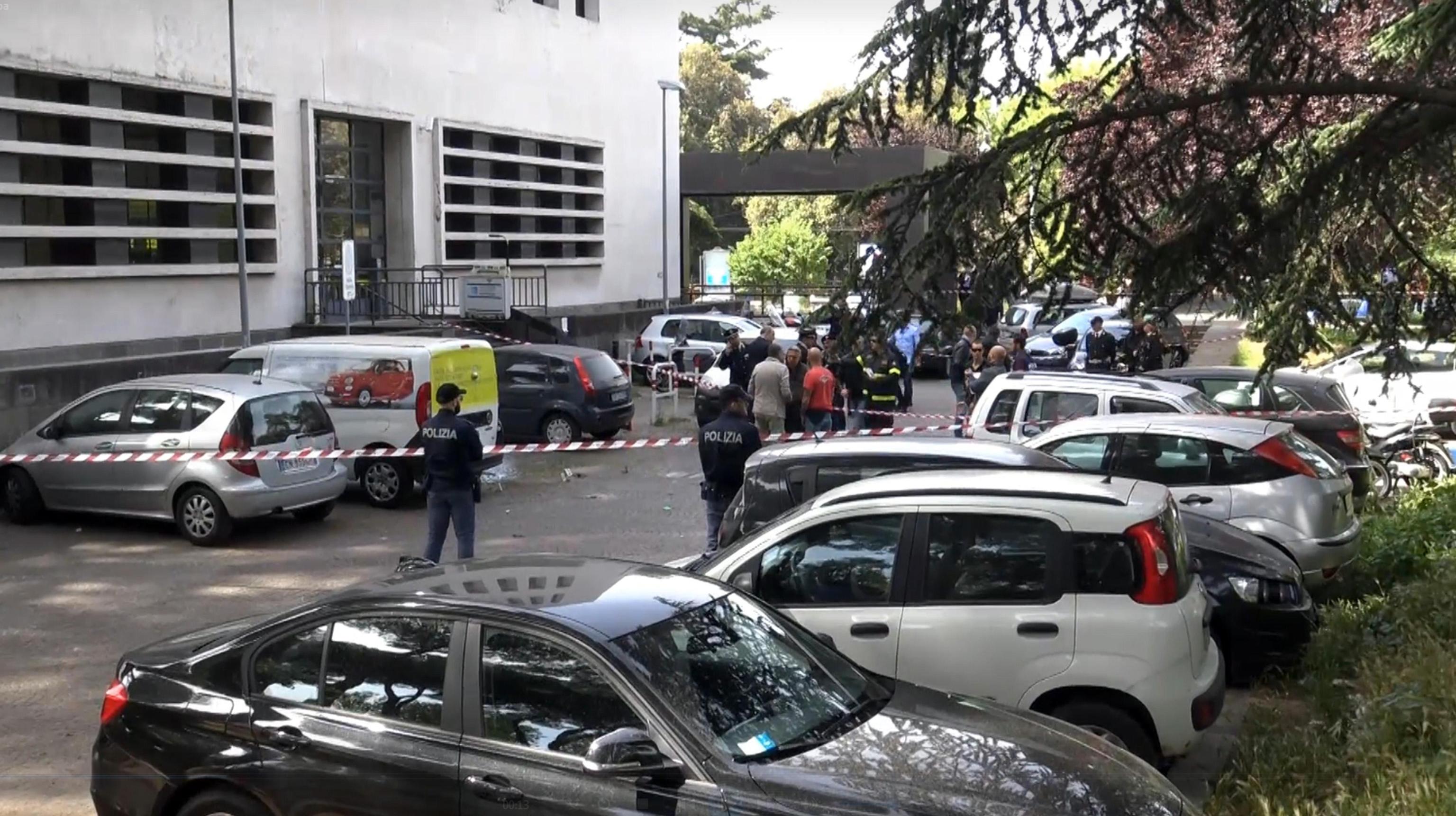 Un fermo immagine tratto da un video di Alanews mostra le forze dell’ordine sul luogo dove è esploso un ordigno in via Marmorata a Roma