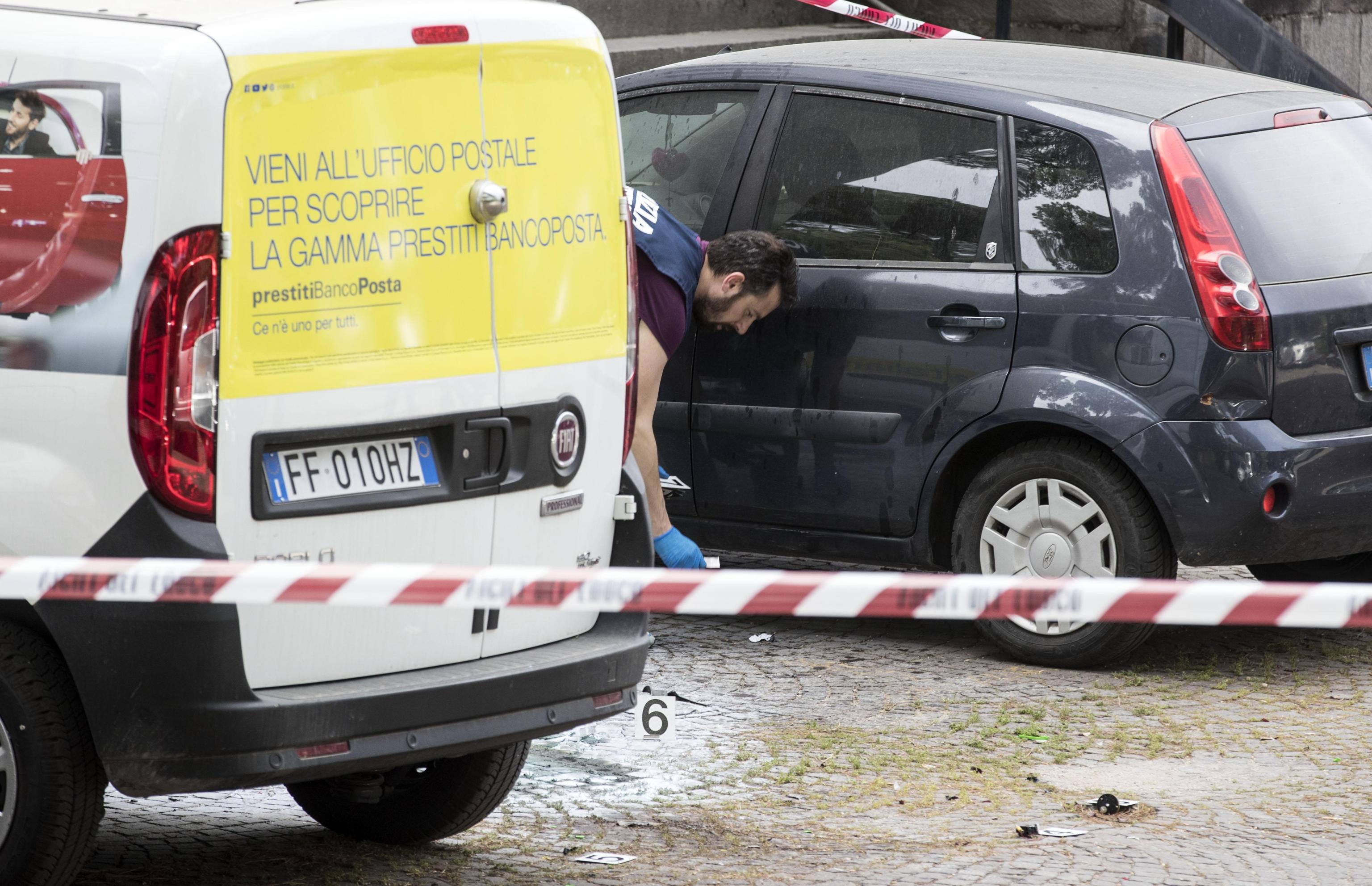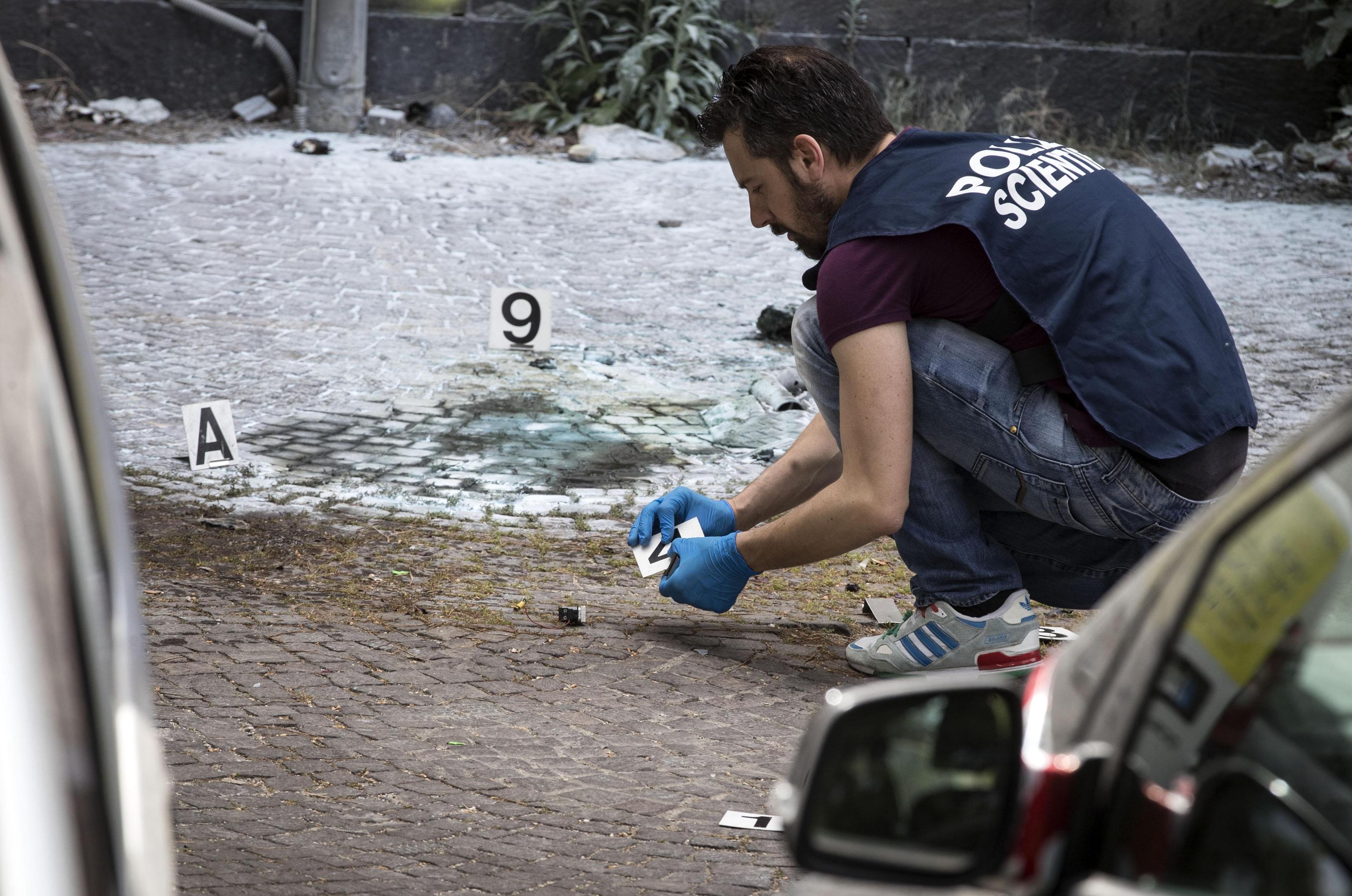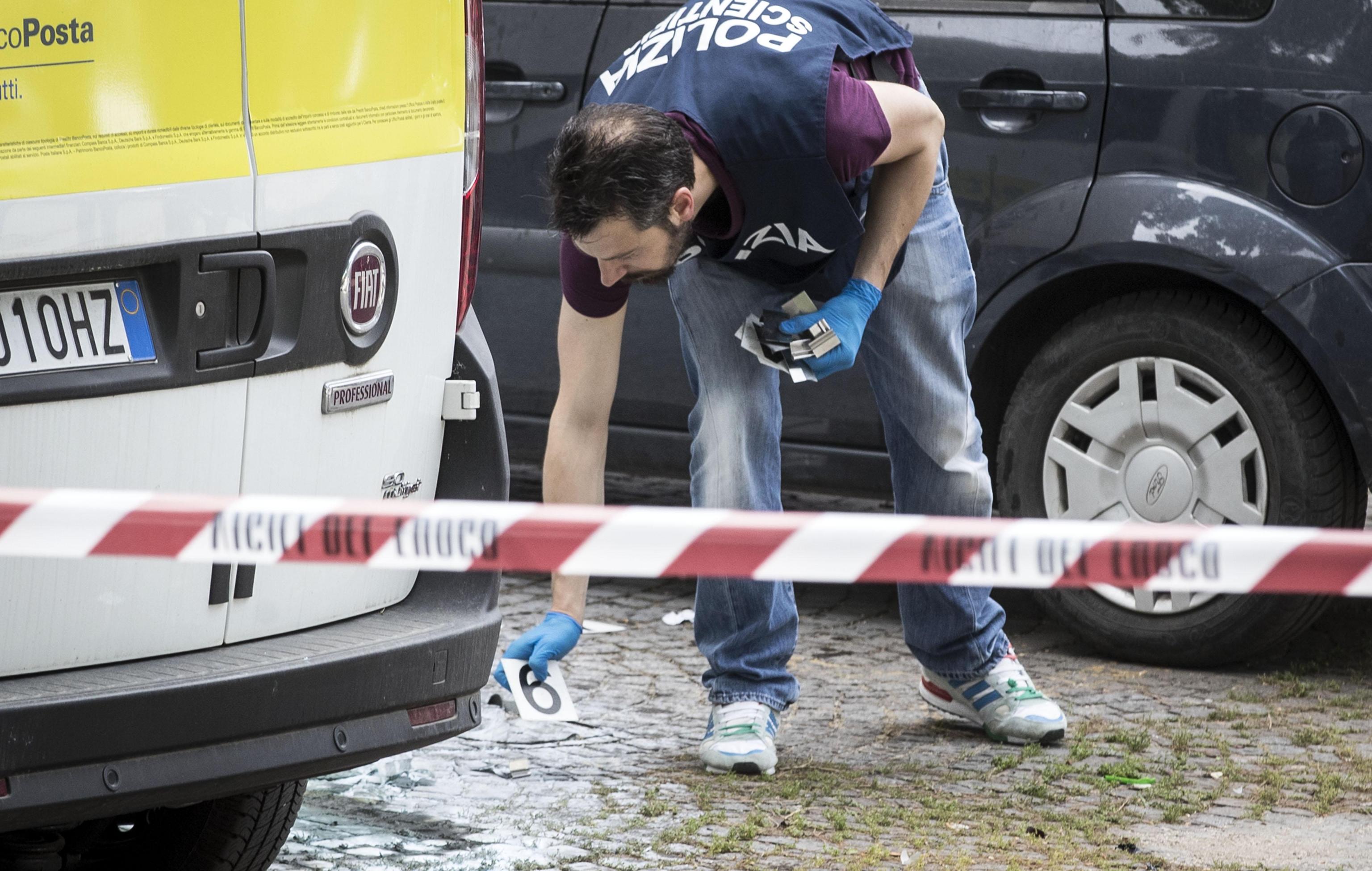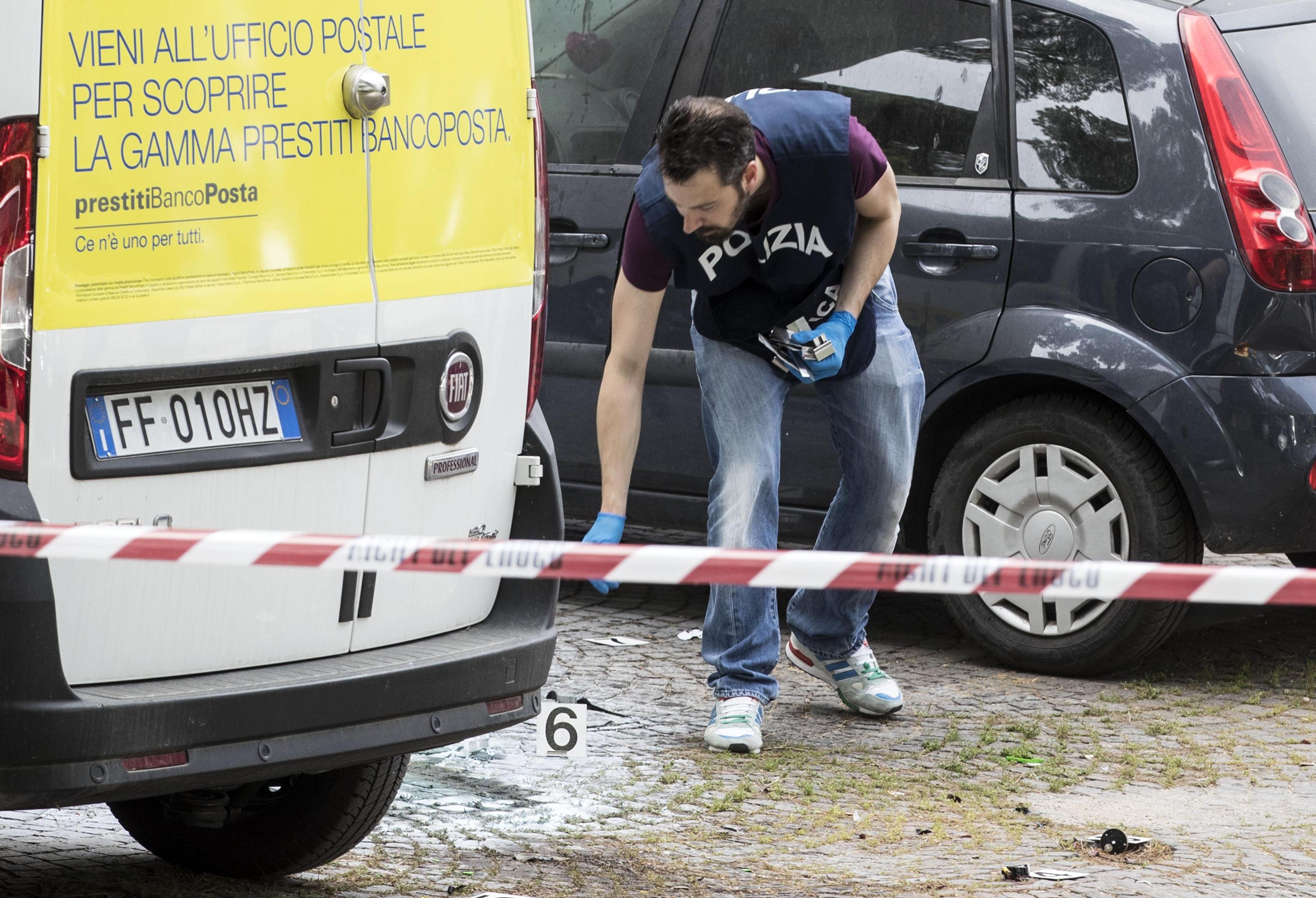 Un agente della polizia scientifica fa dei rilievi sul luogo dove è esploso un ordigno in via Marmorata a Roma, 12 maggio 2017.
