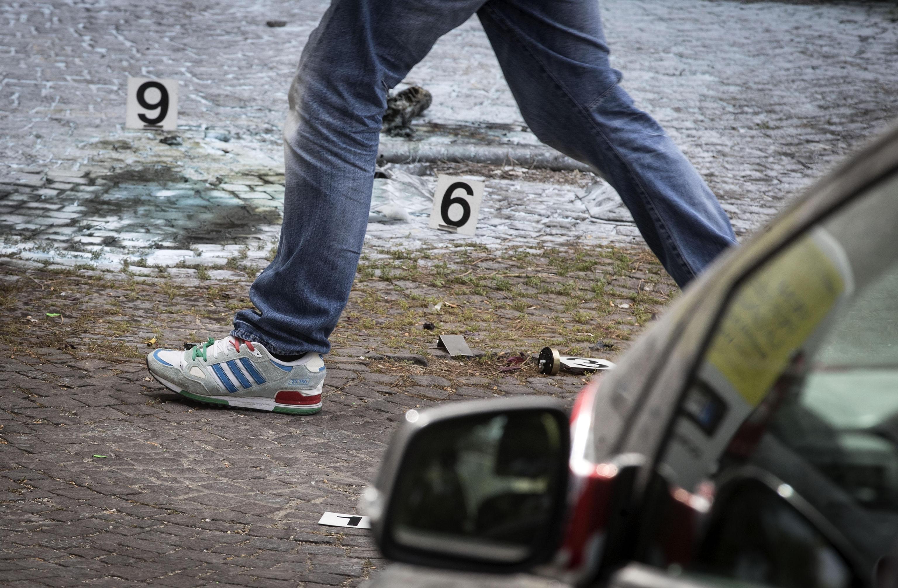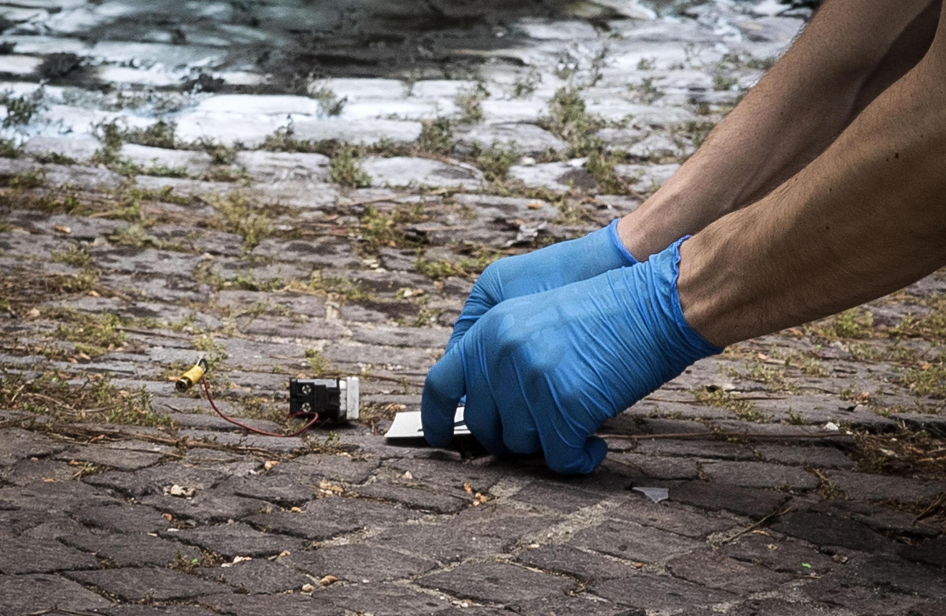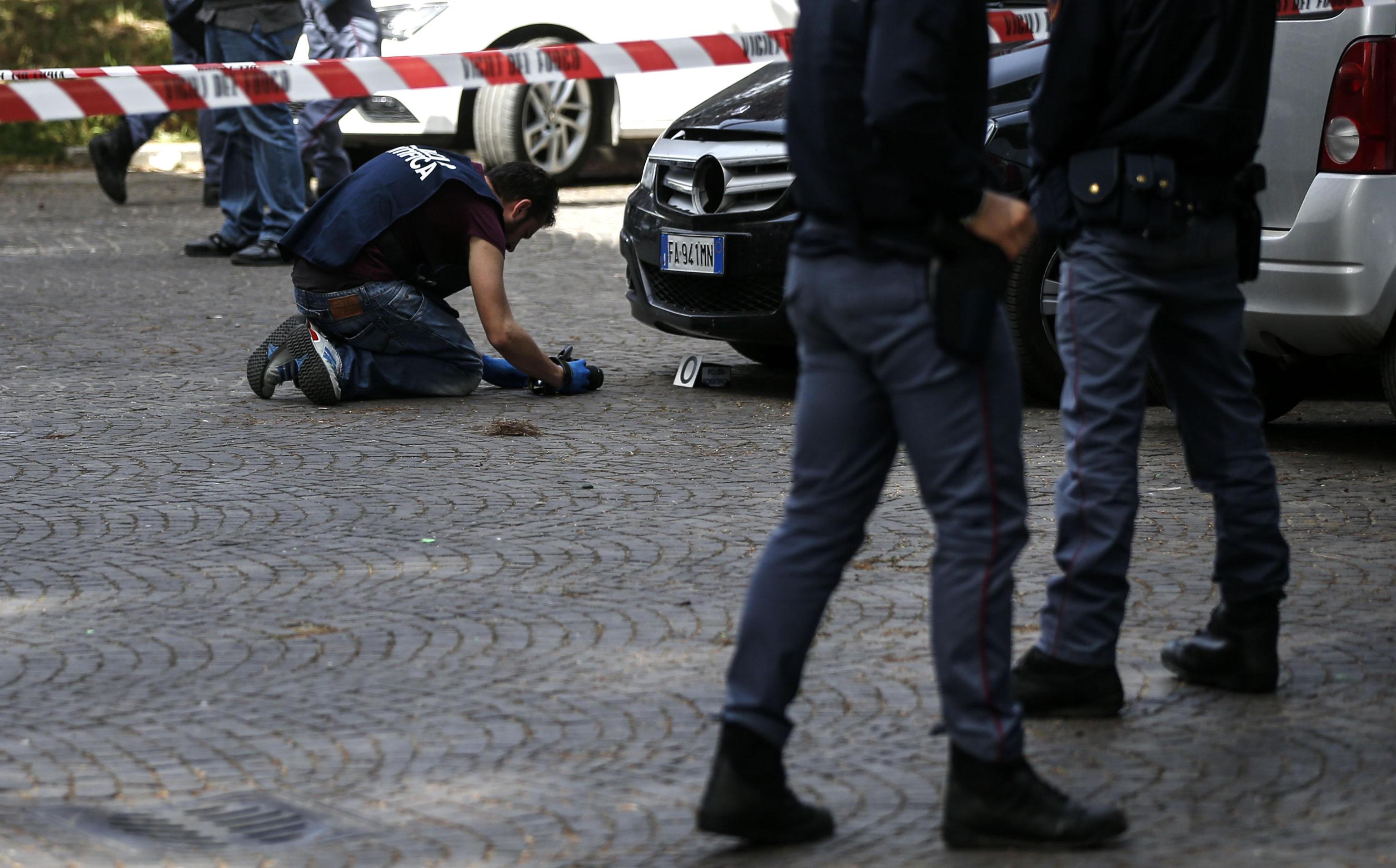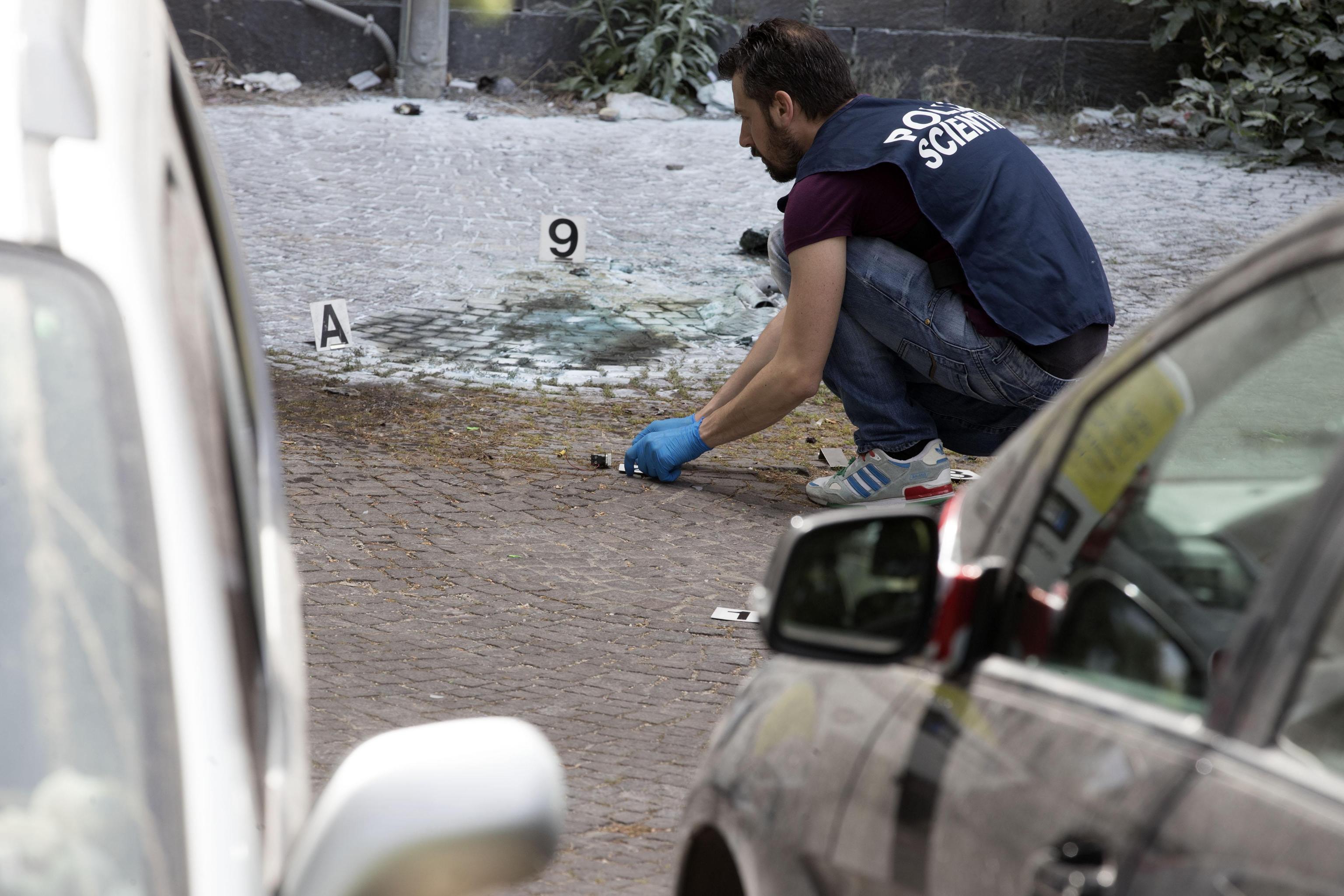 Un agente della polizia scientifica fa dei rilievi sul luogo dove è esploso un ordigno in via Marmorata a Roma, 12 maggio 2017.