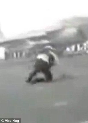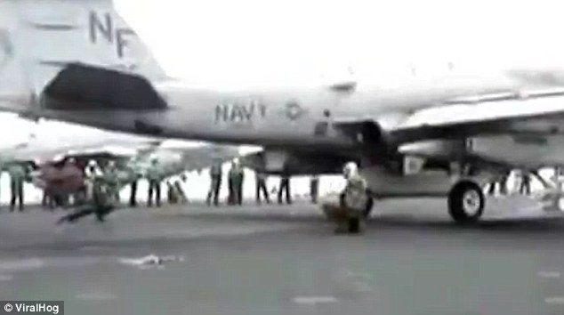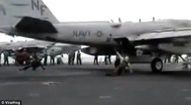 Nel filmato si vede l’uomo che mostra il pollice in su al pilota, dandogli l’ok per il decollo. Ma nel momento in cui il jet aziona i motori, il meccanico viene letteralmente travolto dal turbine di aria spostata dai rotatori e viene scaraventato all’indietro lungo il ponte, per oltre 30 metri.