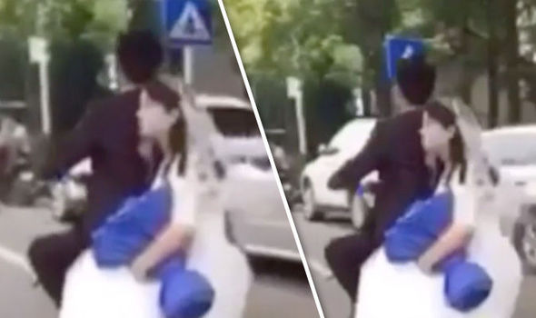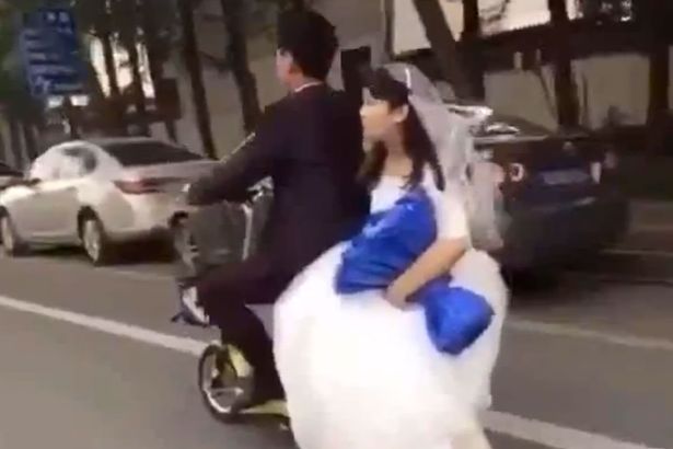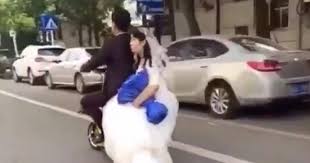 CHONGQIONG – Uno sposo porta la sua futura moglie sullo scooter per le strade di Chongqiong in Cina. La donna è in sella seduta di lato, la posizione tipica delle donne che indossano le gonne e la stessa che ricorda le vecchie foto dei viaggi delle coppie degli anni Sessanta che viaggiavano a bordo della Vespa o della Lambretta. La strada su cui i neo sposi probabilmente in partenza per il viaggio di nozze stanno passando ha dei dossi che servono per far rallentare gli automobilisti. Uno di questi viene superato provocando un sobbalzo del mezzo che fa cadere a terra la sposa in abito bianco.