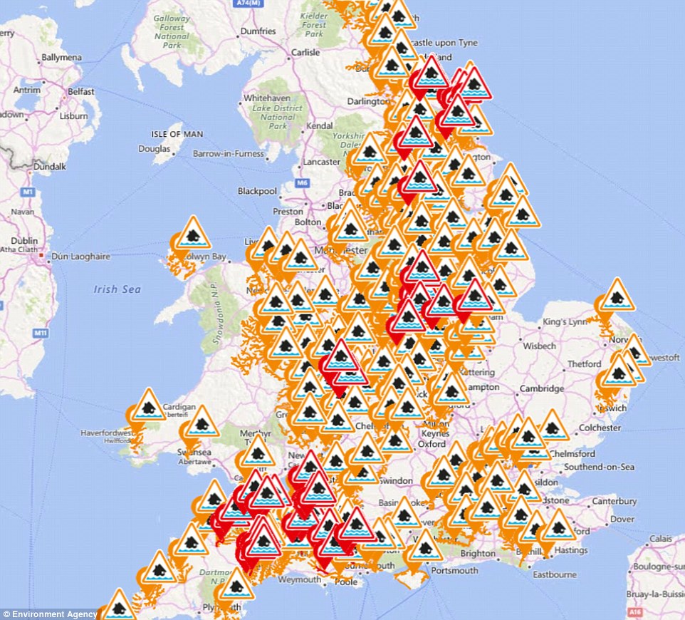 Decine di allarmi alluvione sono stati emessi dalle autorità e vengono mostrate dai media del Regno le immagini di intere vie di alcune città, come Bristol, e di piccoli villaggi, in particolare nello Yorkshire, sommersi dalle acque. Gravi disagi ai trasporti pubblici, con treni cancellati e strade bloccate, mentre un traghetto è dovuto restare in mare aperto per tutta la notte perchè era impossibile attraccare in un porto del Galles. A Folkestone nel Kent, una donna di 39 anni è finita in mare a causa dei venti fortissimi. Salvata da un elicottero della Guardia costiera, è poi morta in ospedale.