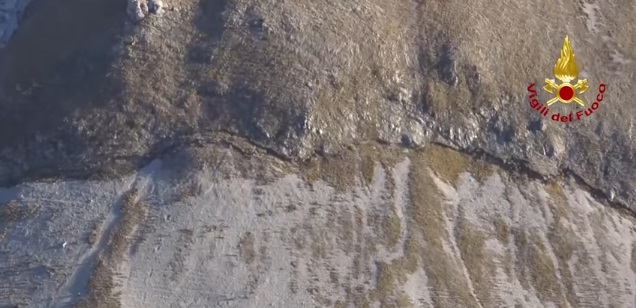 Da lontano non si percepisce nulla ma quando l’elicottero si avvicina al fianco del Vettore i due solchi appaiono nitidamente. Quel che si vede è l’evidenza superficiale della faglia, spiega Francesco Violo, consigliere nazionale dell’Ordine dei Geologi:
