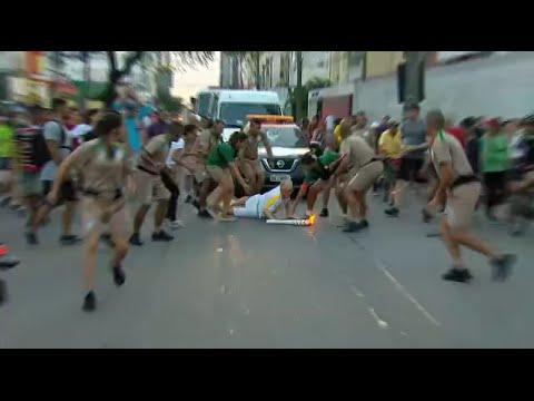 RIO DE JANEIRO – Joao Reinaldo Costa Lima Neto perde improvvisamente l’equilibrio cadendo a terra mentre sta facendo il tedoforo per i Giochi di Rio 2016.