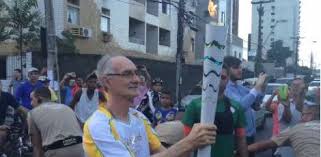 L’ex campione di nuoto brasiliano cade rovinosamente in avanti insieme alla torcia olimpica. L’ex atleta oggi ha 69 anni. Neto disputò le Olimpiadi del Messico nel 1968: dopo essere caduto a terra è stato subito soccorso e ha poi ripreso la parata.